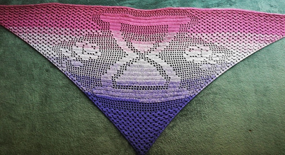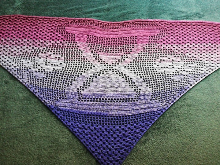 Die Anleitung ist auf 4 Seiten in teilweise Schrift (Erklärung Filethäkeln), der Anfang des Tuches in Pc-Häkelschrift und Zählraster geschrieben.
