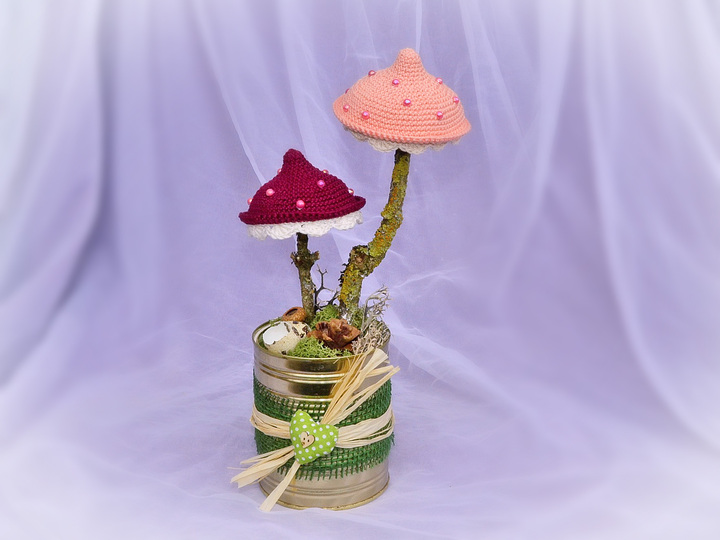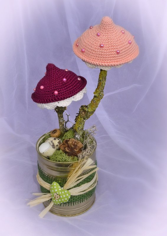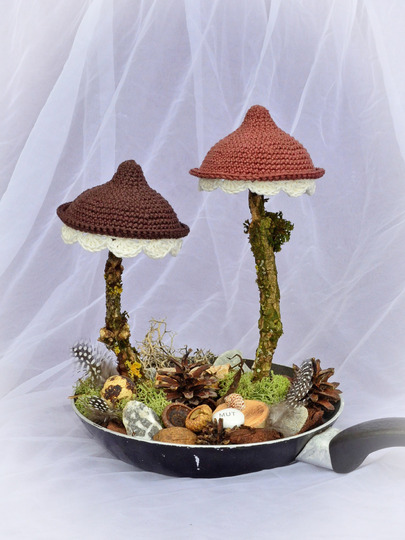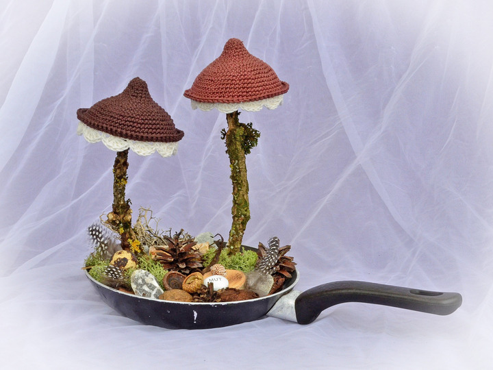 Gehäkelt werden nur die Kappen, der Rest, z.B der Stiel besteht aus Ästen oder Holzstangen, auf die die Kappen befestigt werden.