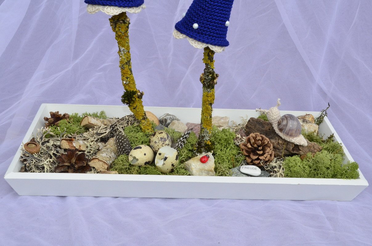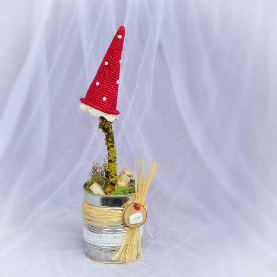 Gehäkelt werden nur die Kappen, der Rest, z.B der Stiel besteht aus Ästen oder Holzstangen, auf die die Kappen befestigt werden.