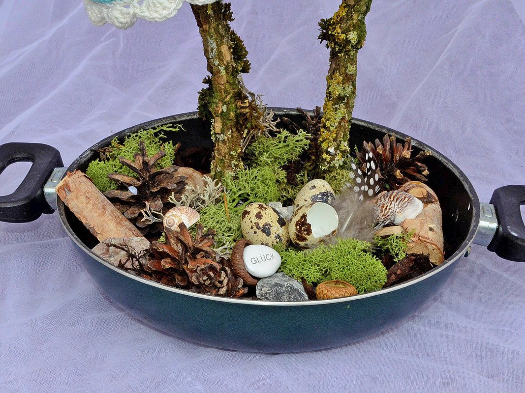 Taubeneier, Spruchsteine, Ziermoose, kleine Astscheiben , Zierkies oder