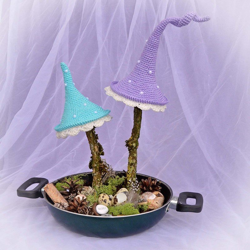 Gehäkelt werden nur die Kappen, der Rest, z.B der Stiel besteht aus Ästen oder Holzstangen, auf die die Kappen befestigt werden.