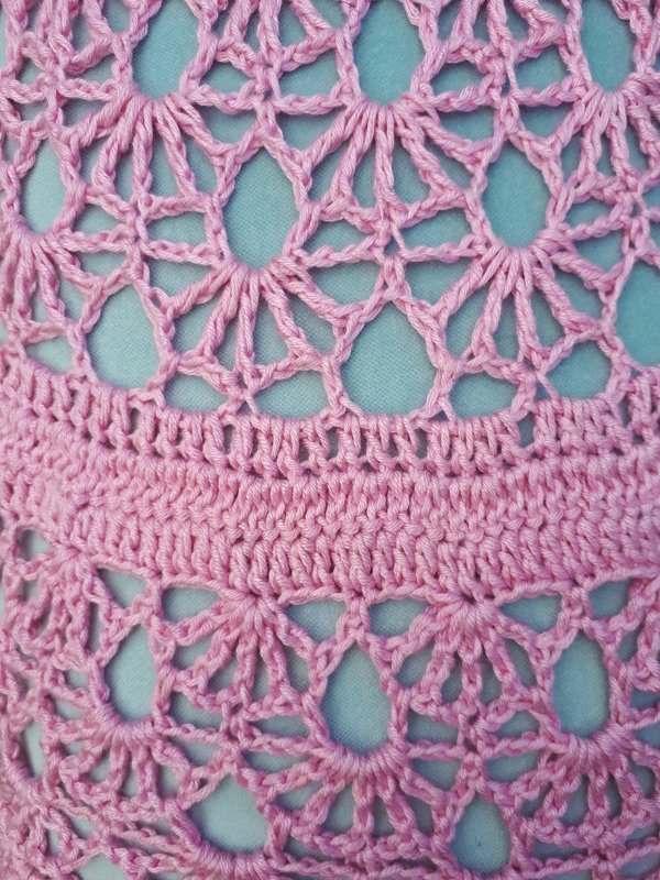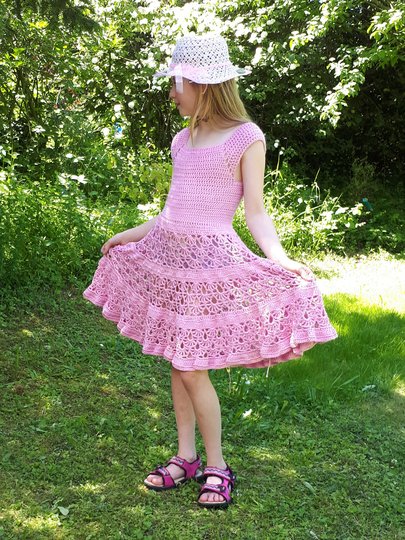 Das Muster sieht im ersten Moment etwas kompliziert aus, kann aber nach kurzer Zeit auch ohne Anleitung weitergearbeitet werden. Damit kann das Kleid auch gut unterwegs z.B. im Urlaub als Projekt gehäkelt werden.