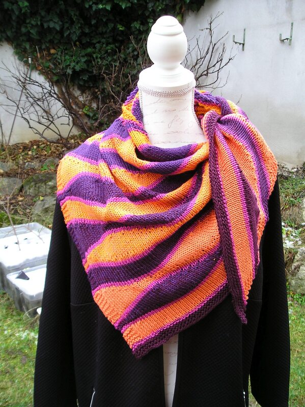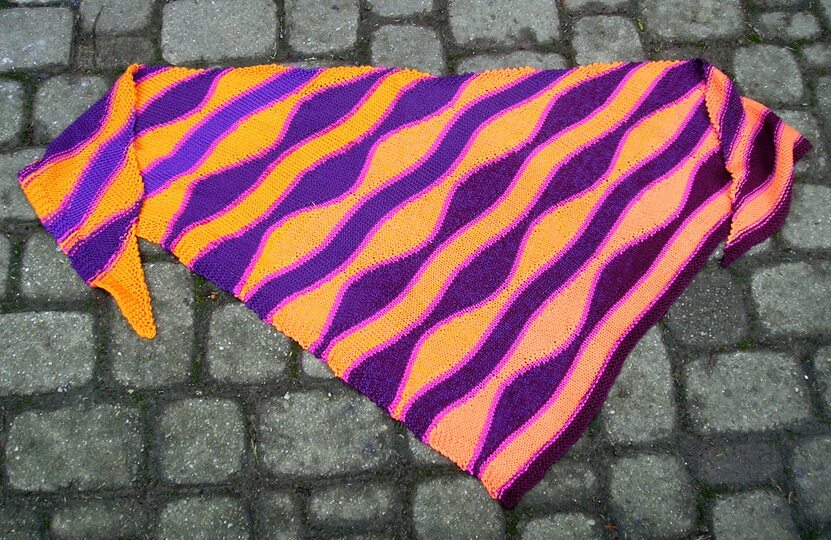 Das Tuch wird mit einem LoLa-Farbverlaufsbobbel aus 6-fädigem Garn (50 % Baumwolle, 50 % Acryl) von der Garnmanufaktur gestrickt.Man beginnt an einem Zipfel des Dreiecks und nimmt an einer Seite Maschen zu, damit das Tuch in die Breite wachsen kann. Die Rauten werden mit verkürzten Reihen gestrickt. Dazwischen strickt man ein paar Reihen glatt rechts. Die Rauten und die glatt rechten Streifen werden von einfarbigen Streifen eingefasst. Um die Farbverteilung zu erreichen, verstrickt man den Bobbel abwechselnd von innen und von außen. Das ist ein Tuch für fortgeschrittene Strickerinnen. Obwohl... für die verwendeten Rauten gibt es Strickschriften.