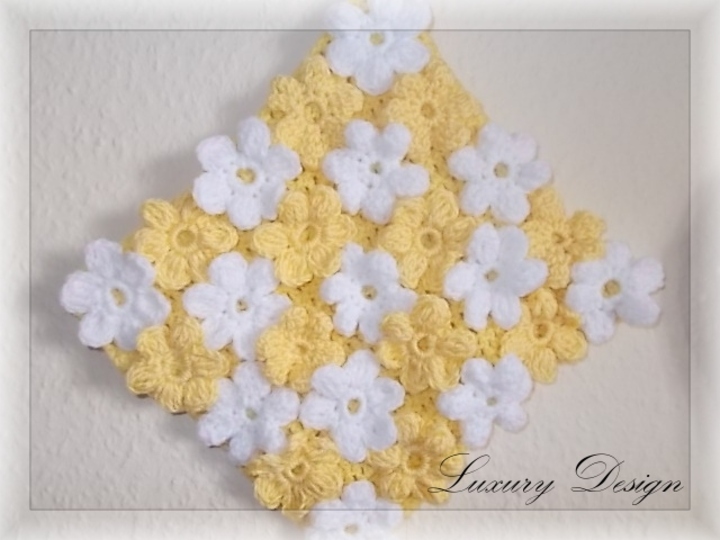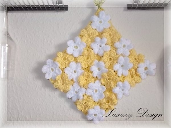 und hübschen Topflappen hält der Frühling Einzug im Haus.Freundliche hellen Farben und die plastischen Blumen machen diesen Topflappen zu einem besonderen Hingucker in der Küche.