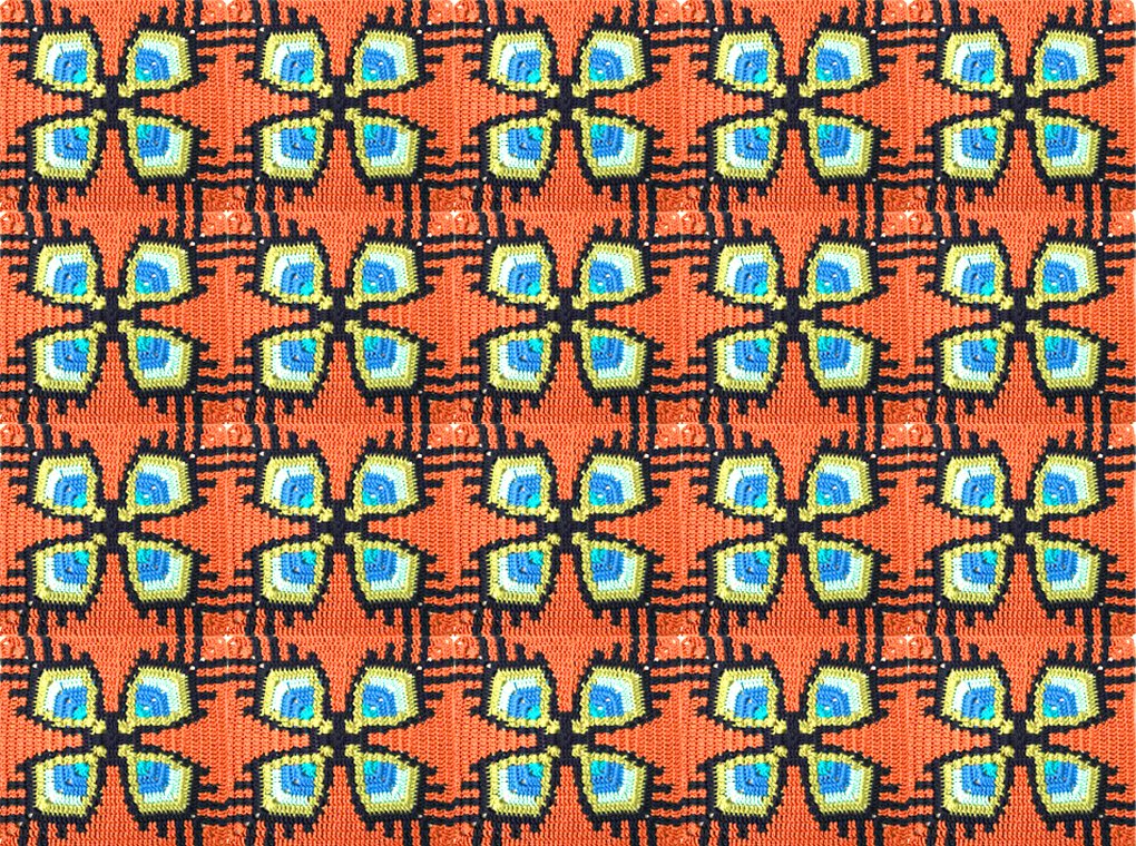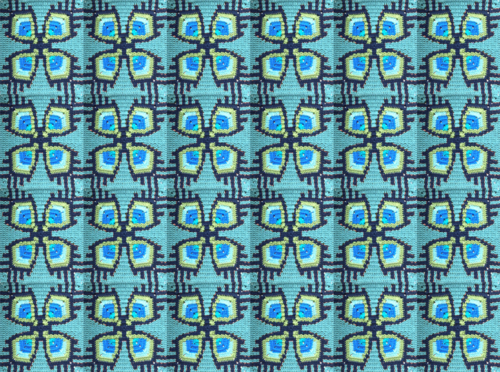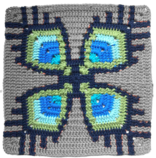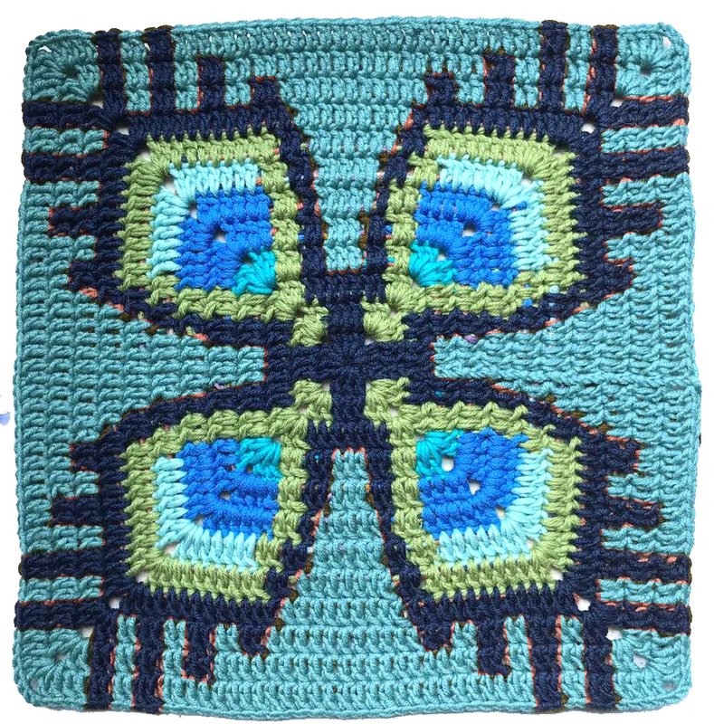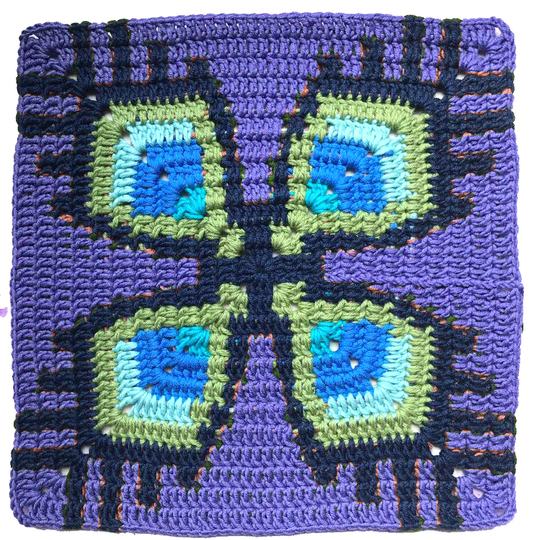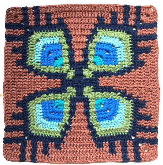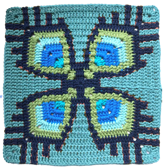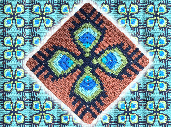 Grannyfliese 6 "Pfauentraum" hat ein herrliches Muster, was besondert zu Vorschein kommt, wenn man mehrer Grannyfliesn zusammenhäkelt und daraus ein Decke macht: Diese Decke erinnert an Mexikanischen Fliesen.
