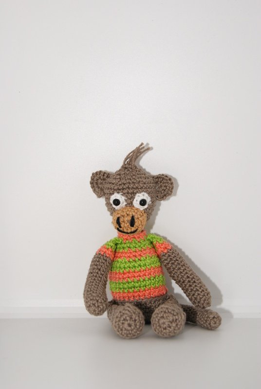 Der Affe hat eine Länge von ca 20 cm. Diese kann je nach Wollart und Nadelstärke abweichen.