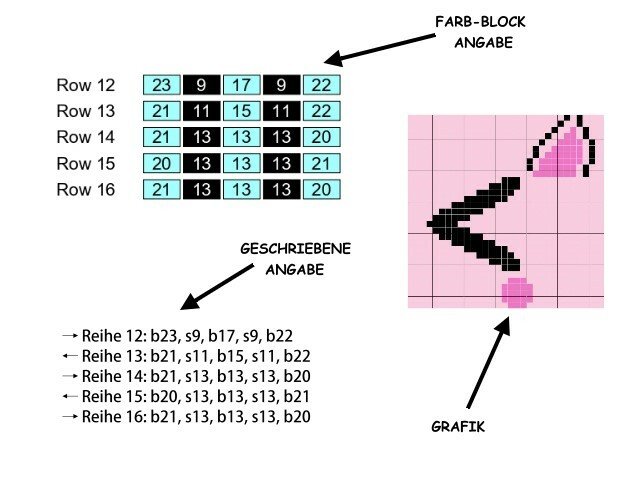 -farbige Zahlen-Blöcke für jede Reihe für feste Maschen (Stb od. hStb)