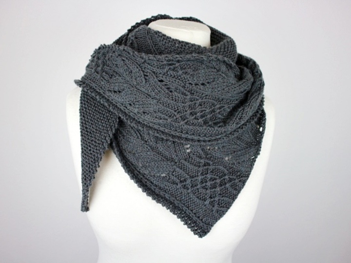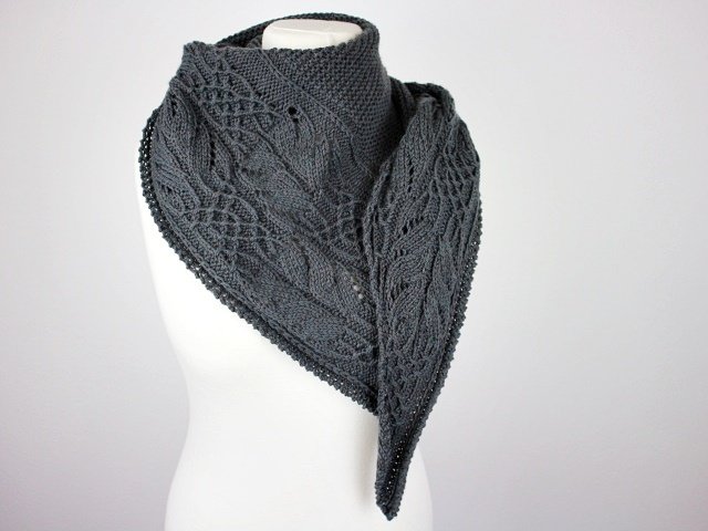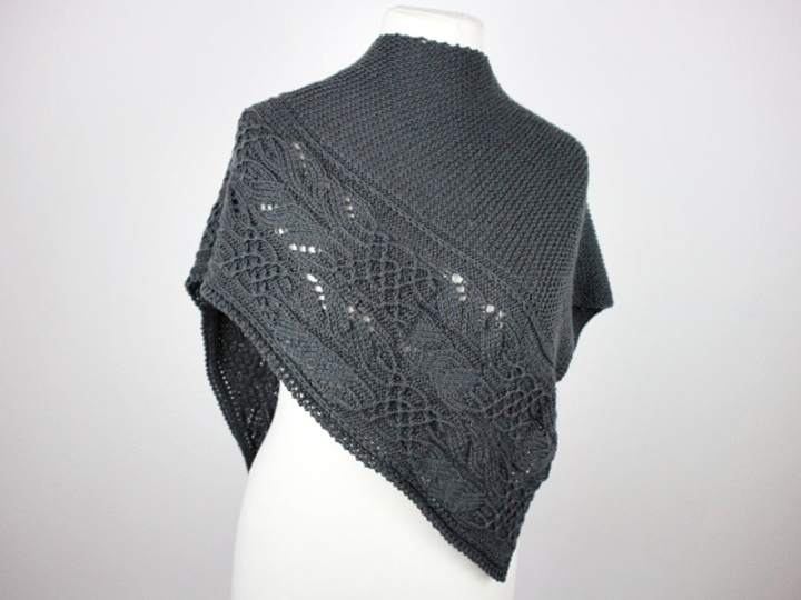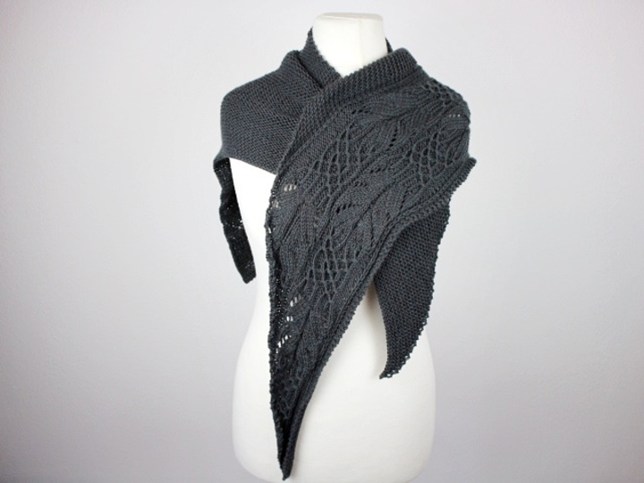 Das Antrazithfarbene Tuch "Elli´s Shawl" beginnt mit nur wenigen Maschen und wird durch seitliche Zunahmen immer größer.