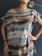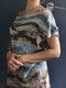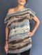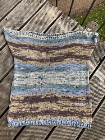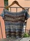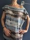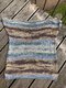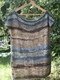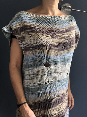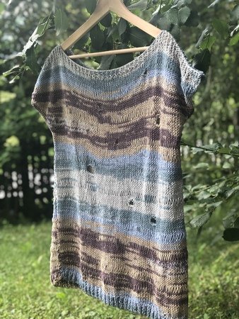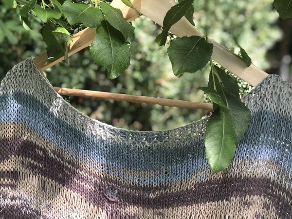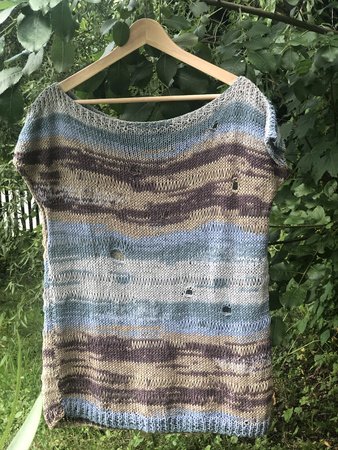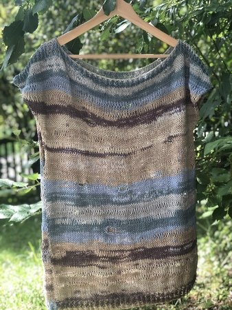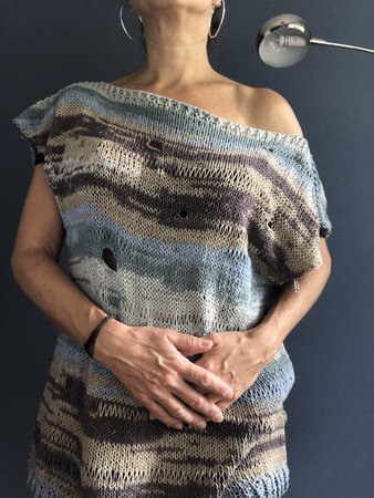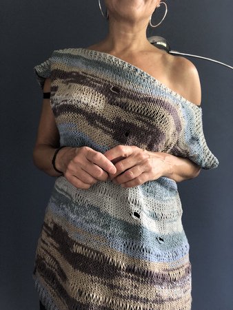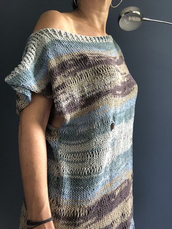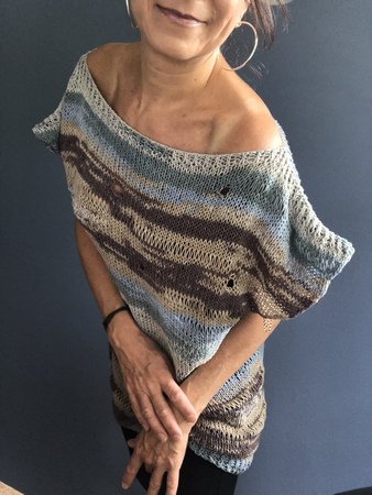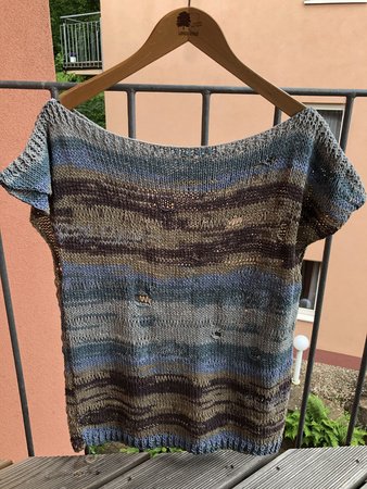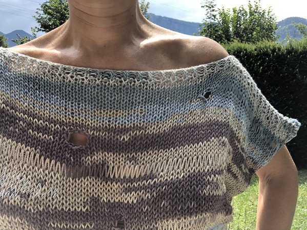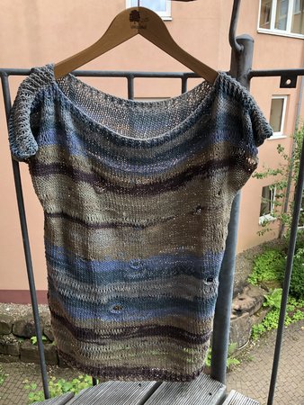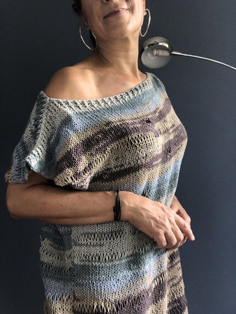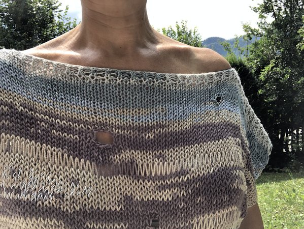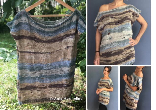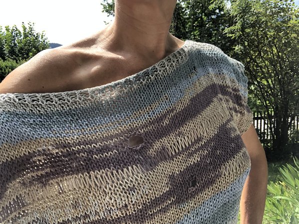 Dieses leichte Shirt wirkt durch seine blauen und erdigen Farbverläufe ausgesprochen farbenfroh und trotzdem nicht zu bunt. Eingestrickte Löcher und Reihen mit Fallmaschen machen es noch transparenter und gewähren „Durchblick“ an ausgewählten Stellen. Der Ausschnitt ist bewusst groß gehalten, und Du kannst es auch ganz leger über eine Schulter fallend tragen. Mir gefällt es am besten zu Jeans oder einer sommerlichen schmalen Hose. In kälteren Jahreszeiten kannst Du es z. B. auch mit einem Rolli anziehen.