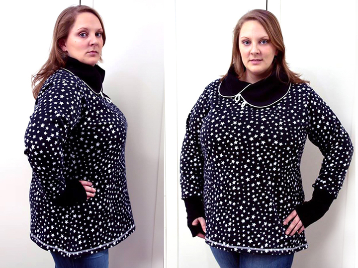 Der Kragenhoodie sitzt locker und bequem, verdeckt die Problemzonen und kann auch ganz einfach mit einem Bündchen zum Long-Pulli verlängert werden.