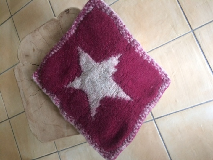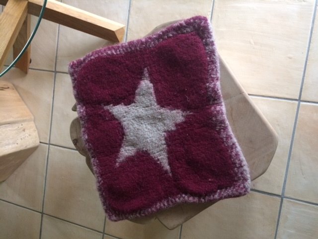 Dieses schicke Sternenkissen ist in double face Technik gestrickt. D.h. es hat 2 Außenseiten, wird in einem Stück gestrickt und zeigt mal den beigen Stern und ein anderes Mal den bordeaux farbigen Stern. Gestrickt wird ganz ohne Fäden ziehen auf der Rückseite oder lästiges Zusammennähen am Schluss. Anschließend wird das Kissen in der Waschmaschine gefilzt und so ergibt sich eine gemütliche Sitzunterlage für zu Hause oder unterwegs, denn zusammengerollt ist es auch platzsparend zu transportieren.