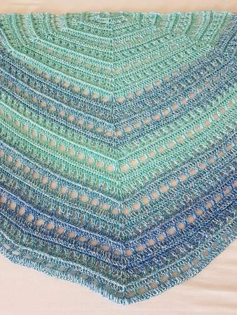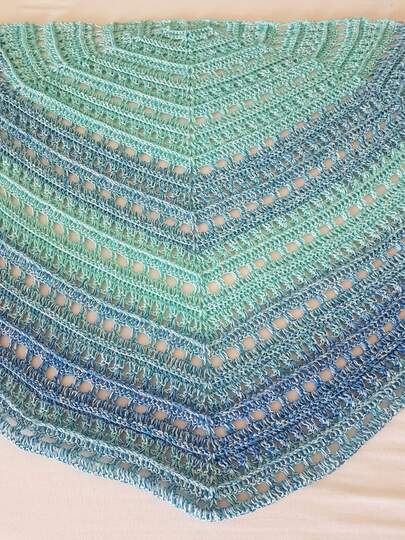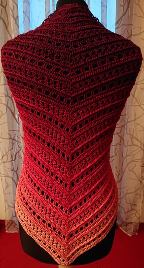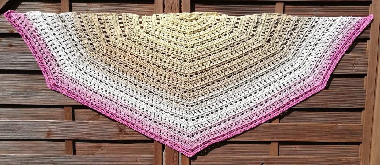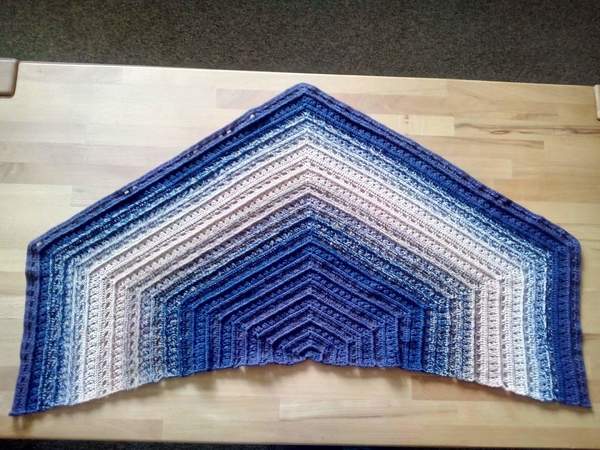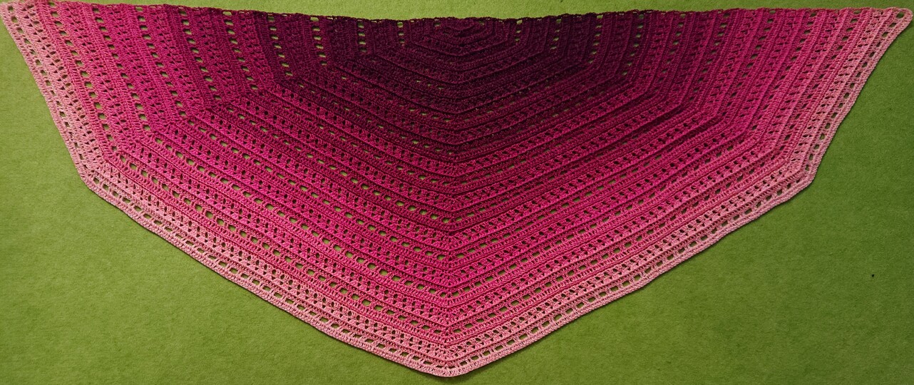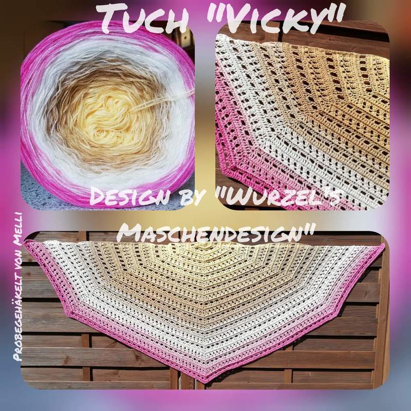 Die Anleitung zum Tuch Vicky besteht aus schriftlich ausformulierten Reihen und beinhaltet eine Häkelschrift.