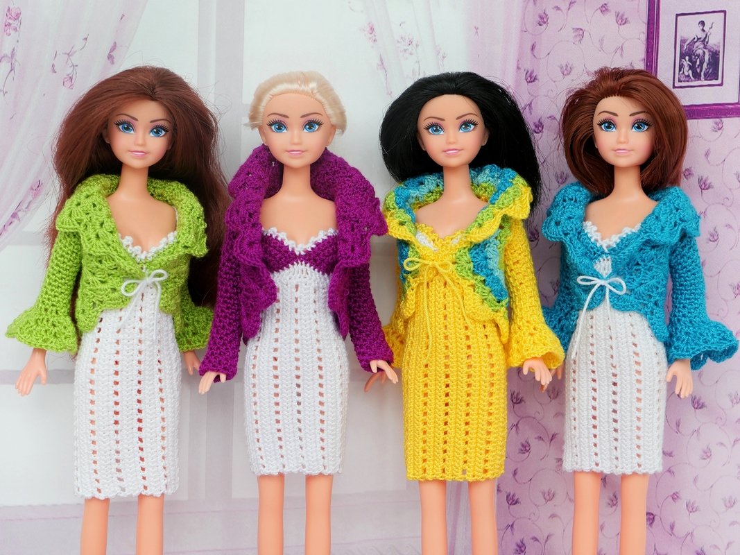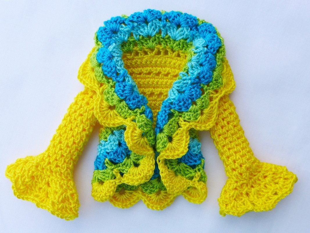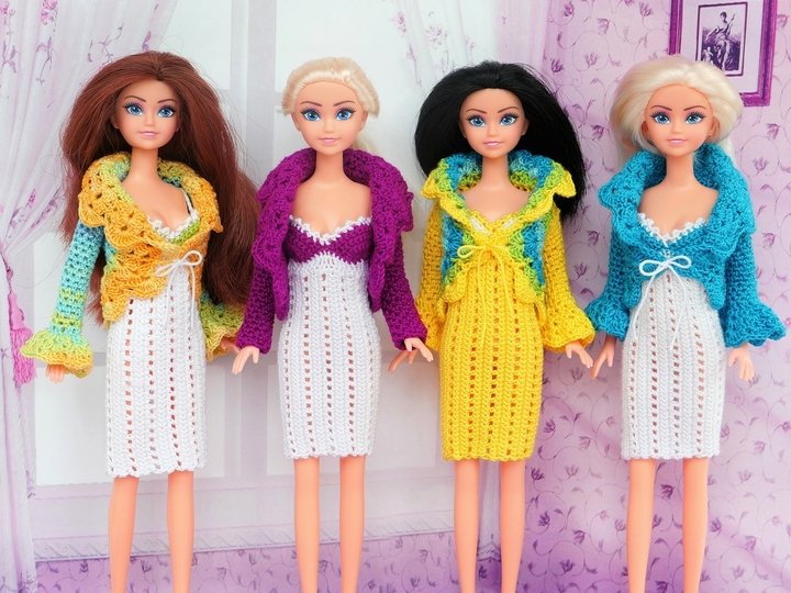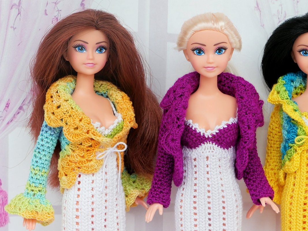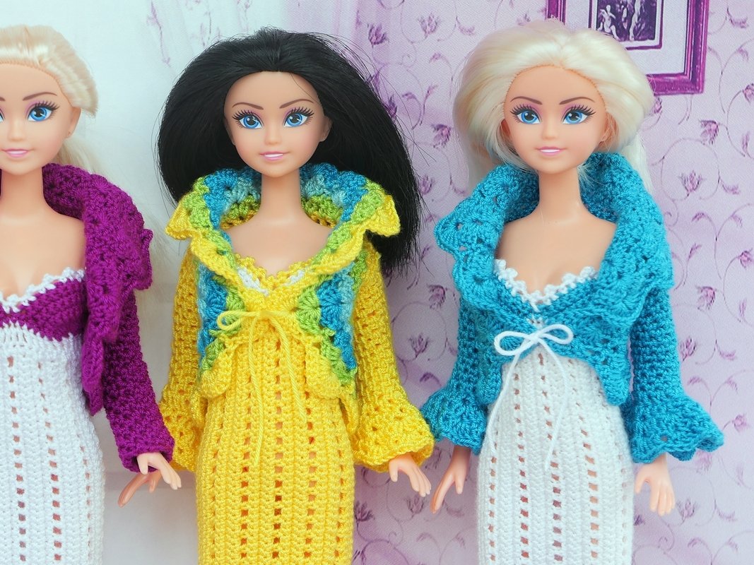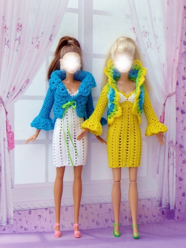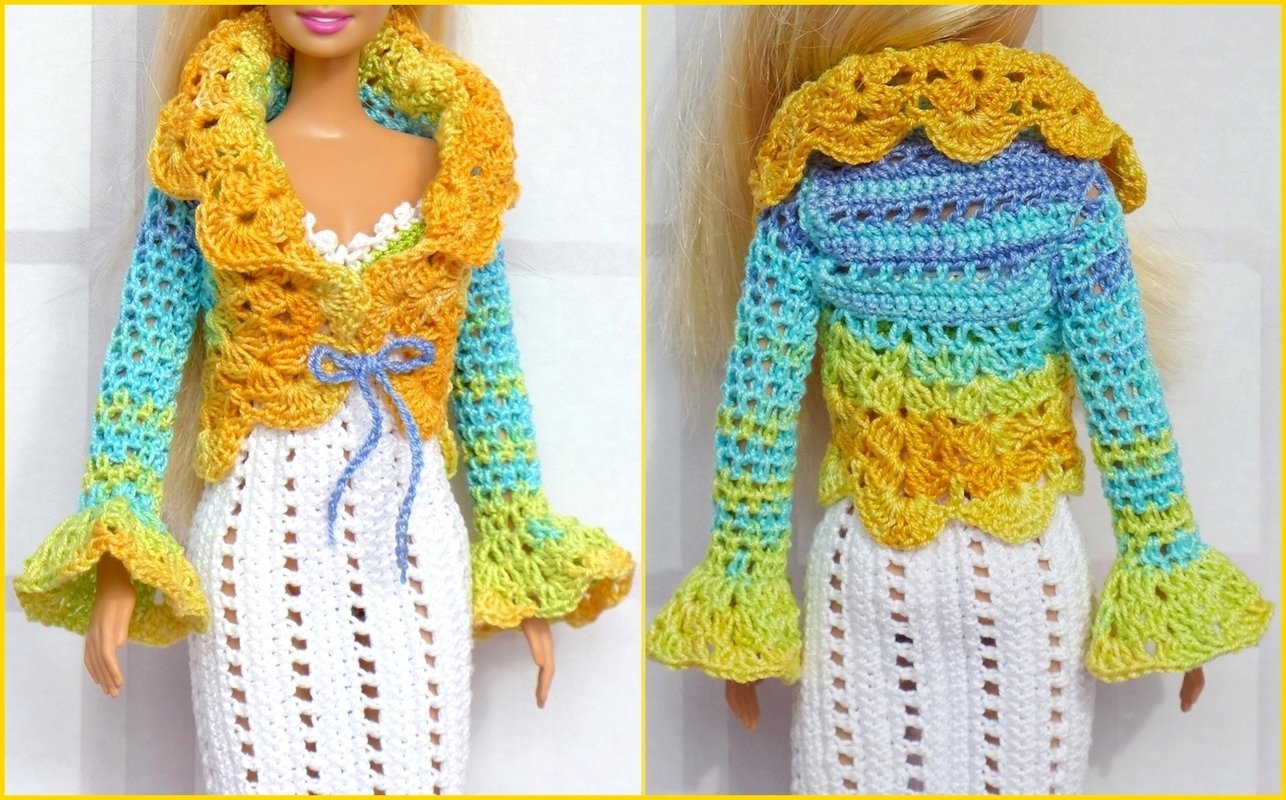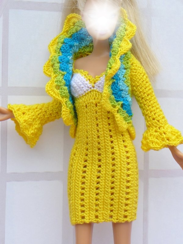 Dazu passend gibt es ein kleines Jäckchen, was offen getragen oder vorne mit einer kleinen Schleife geschlossen werden kann. Es gibt 3 Varianten für die Ärmel: lange Ärmel ohne Volant, 3/4-lange und lange Ärmel mit Volant (siehe meine Beispiele). Ihr könnt das Jäckchen einfarbig, mehrfarbig oder mit Farbverlaufsgarn häkeln. Das Jäckchen kannst Du natürlich auch mit anderen Puppensachen kombinieren (siehe meine Beispiele). Auch das Kleid kann solo getragen werden.