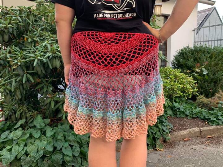 Die Größe ergibt sich individuell durch Wahl des Garns und Häkelnadel. Ich habe 500lm 5-fädigs Garn verbraucht und habe eine Größe von 142*42cm erreicht.