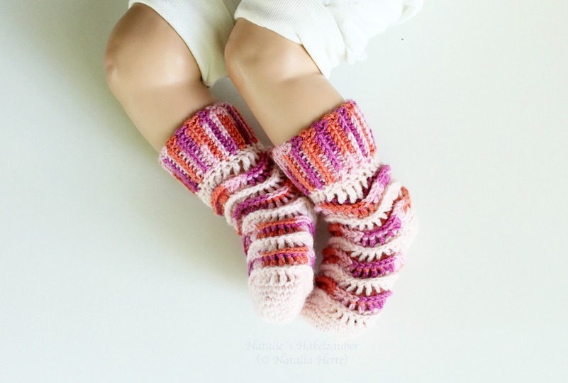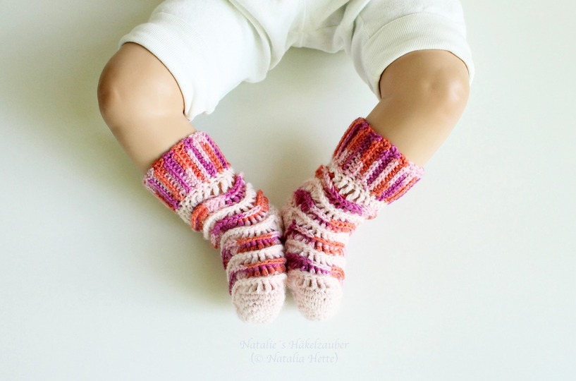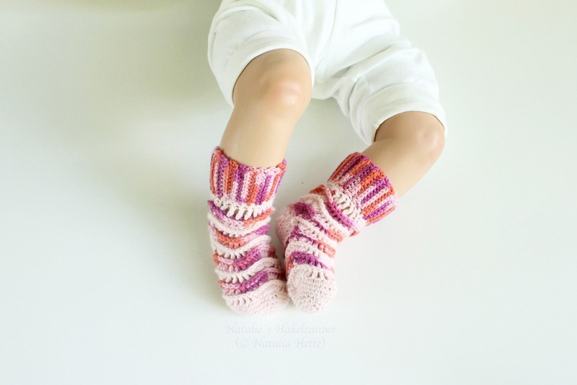 Diese PDF-Häkelanleitung besteht aus bebilderter Anleitung zum Häkeln von Baby- & Kindersocken mit dem Reliefmuster für die Größen ab 0 Monaten bis zum 4-järiges Alter. Das Bündchen der Socken sieht wie gestrickt aus. Die Größe kann man auch für Erwachsenen umgerechnet werden. Die Socken können sowohl zwei- oder mehrfarbig oder einfarbig gehäkelt werden.