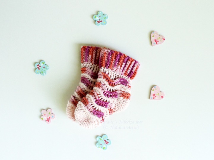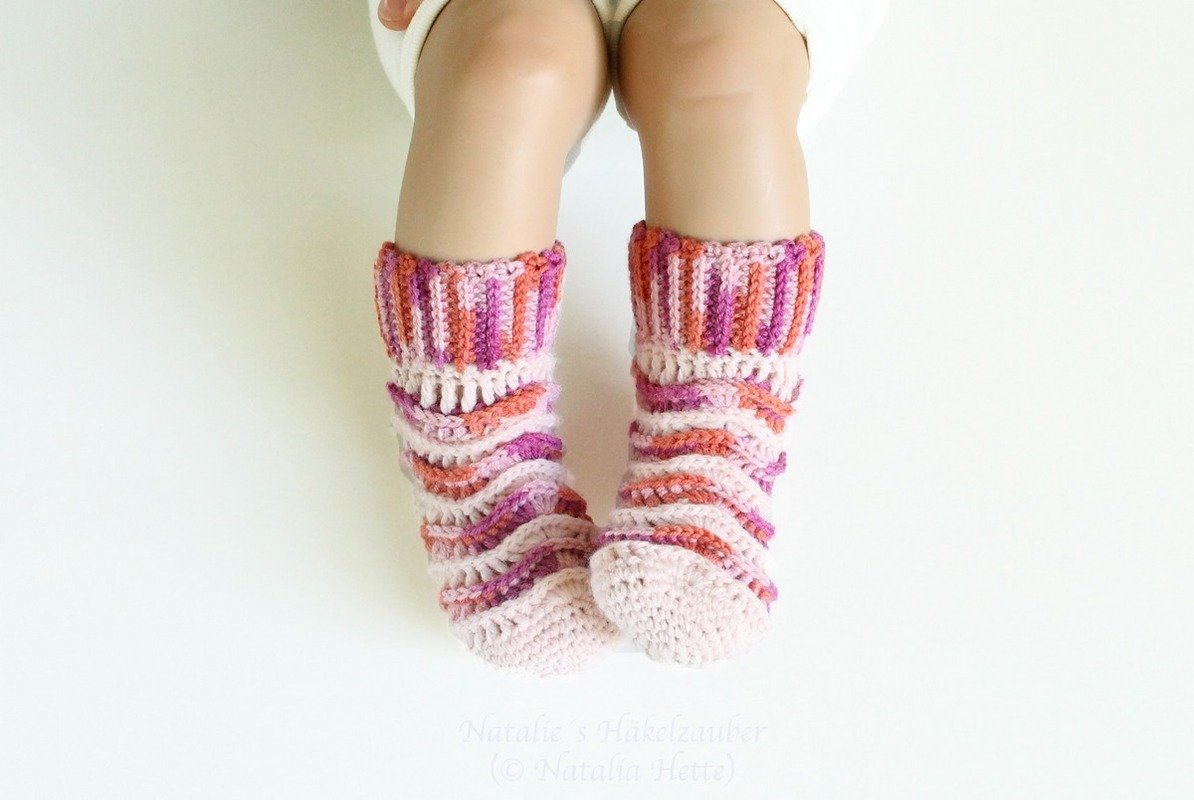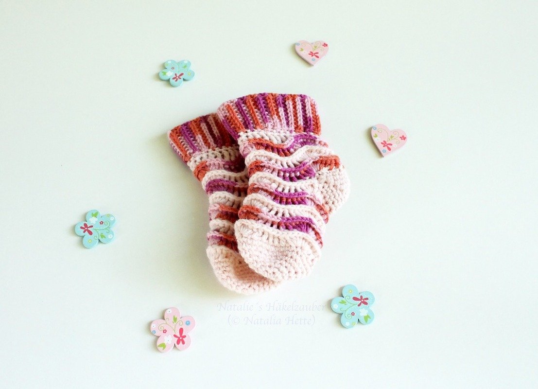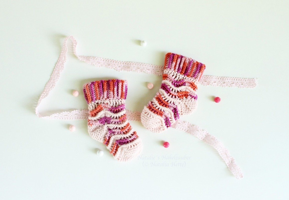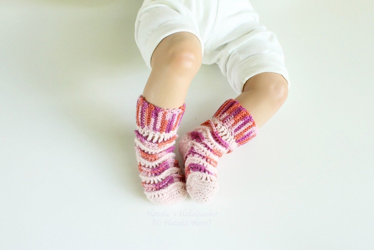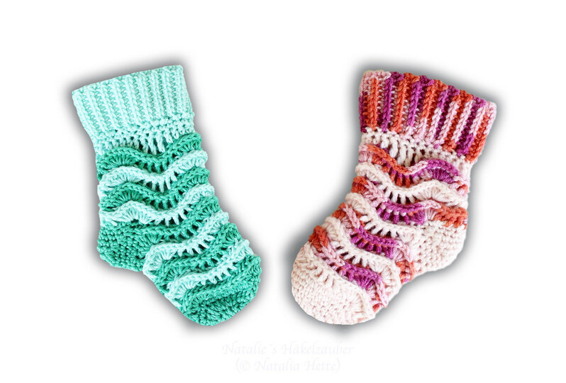 Weiche Baby- & Kindersöckchen schnell für Dein Kind oder Enkelkind häkeln, ist mit dieser Anleitung überhaupt kein Problem! Ein ausgeprägtes Wellenmuster, leicht anpassbare Größe und das Bündchen im Stricklook machen diese Söckchen auf den Baby- und Kinderfüßen sehr entzückend.