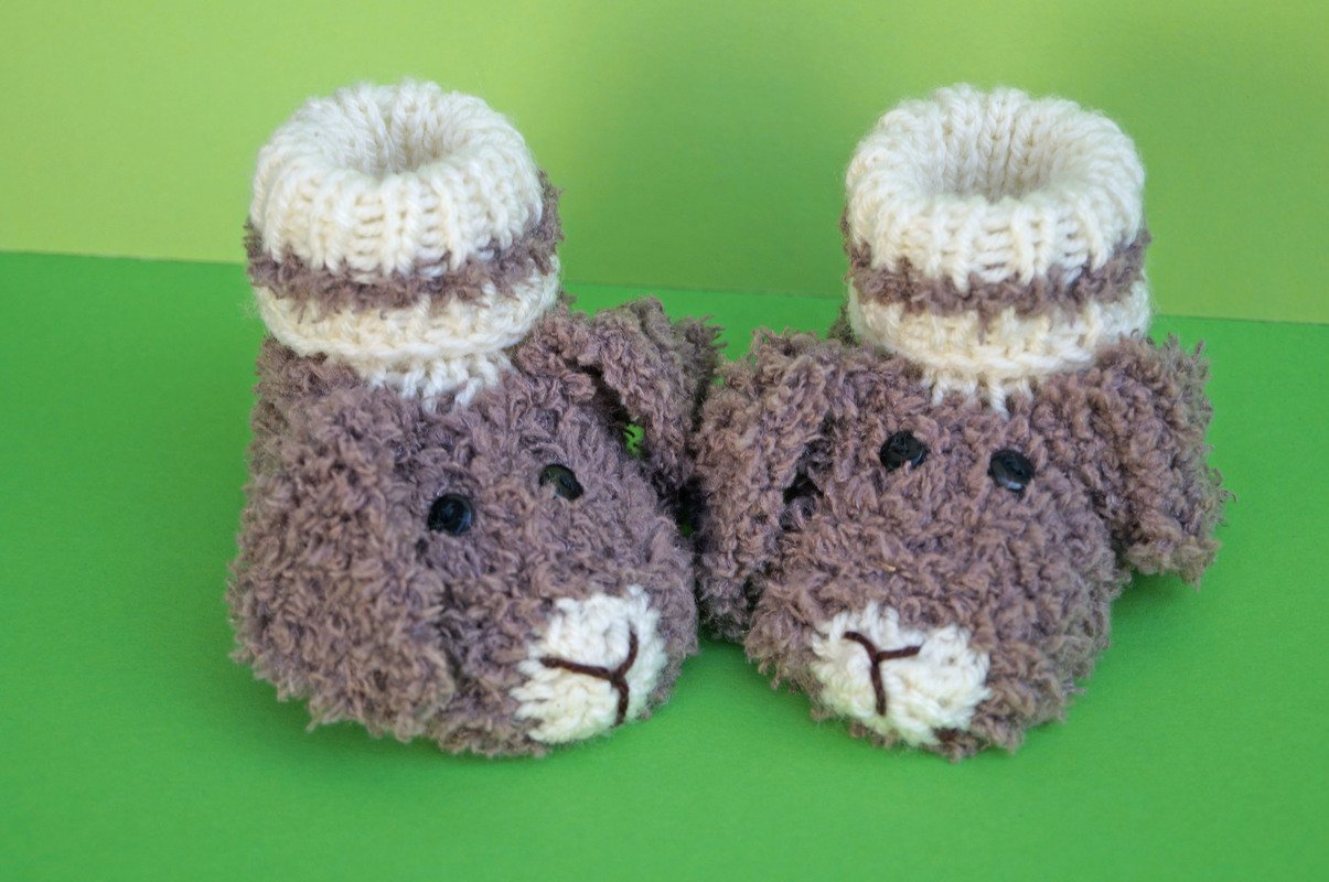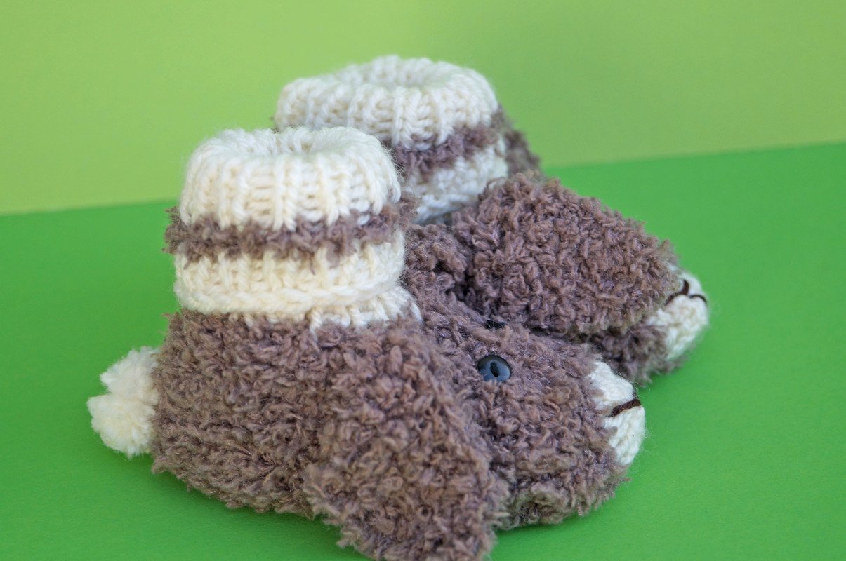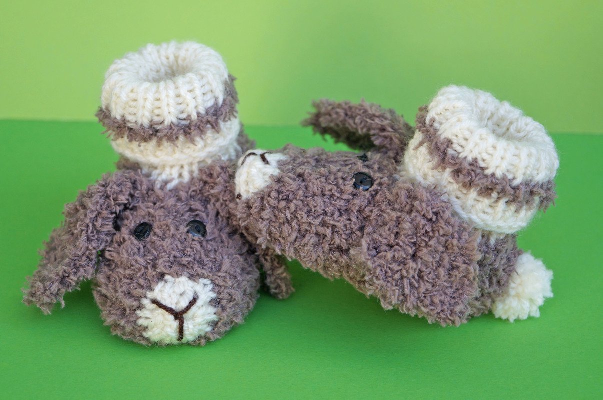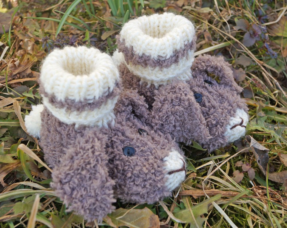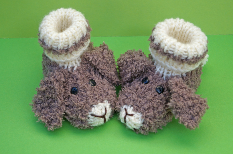 Strickanleitung für kuschlige Baby- Schuhe in der Form eines kleinen Häschens mit Hängohren - nicht nur zu Ostern ein süßer Blickfang an Babys Füsschen.