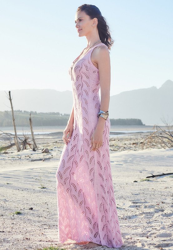 Total angesagt: - ein Maxikleid, bodenlang und in einem kräftigen Rosaton. Das lässige Kleid wird von unten nach oben in einem "Ähren"-Muster gestrickt. Leicht tailliert, mit Rückendekolleté und aus kühler Baumwolle ist es der absolute Sommer-Hit!