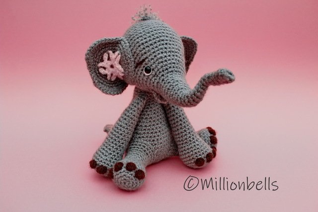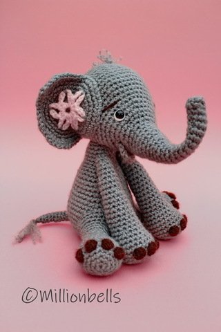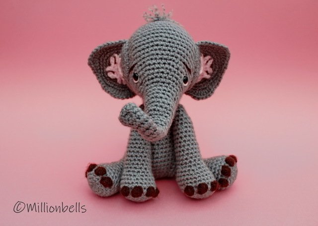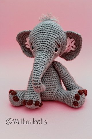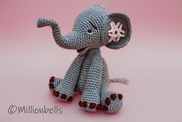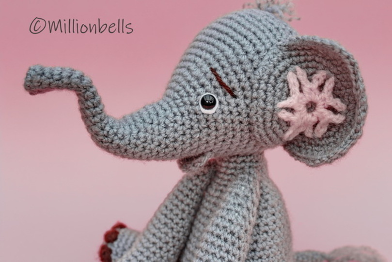 Dieser Elefant wird meistens in fortlaufenden Runden gearbeitet. Der Mund wird in Reihen gearbeitet.