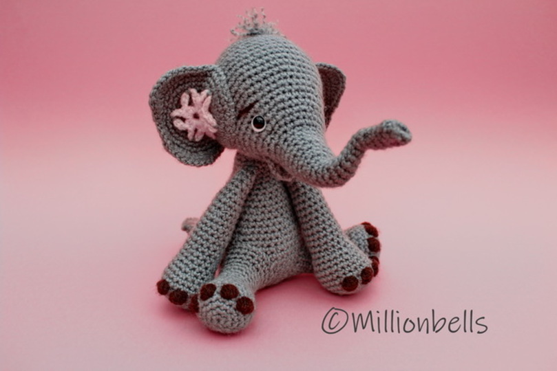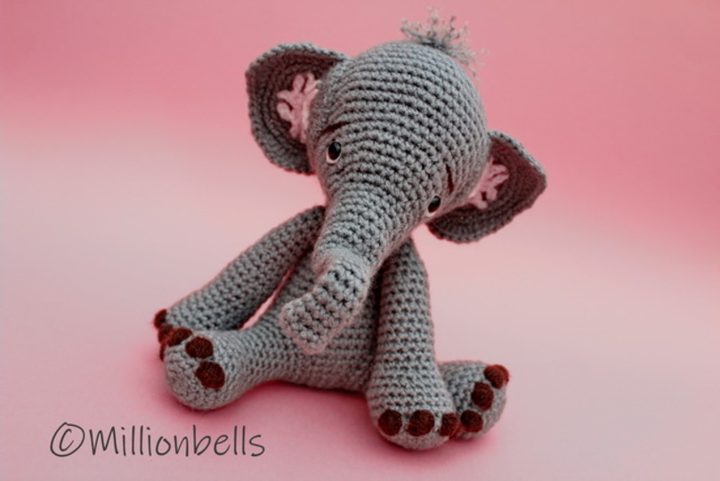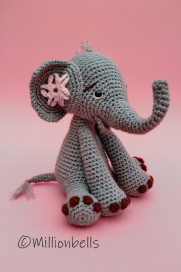 Hergestellt aus Polyacrylgarn und Häkelnadel 3.5 mm, wird der Elefant ca. 20 cm hoch, in sitzender Position. Diese Anleitung eignet sich auch für andere Garne wie Baumwolle oder Wolle.