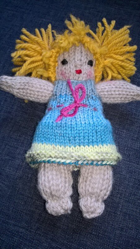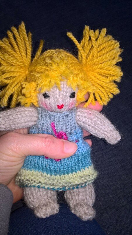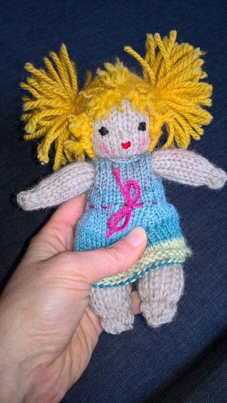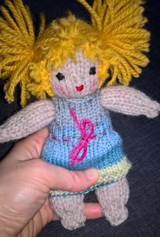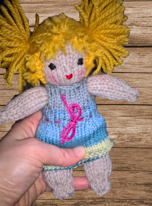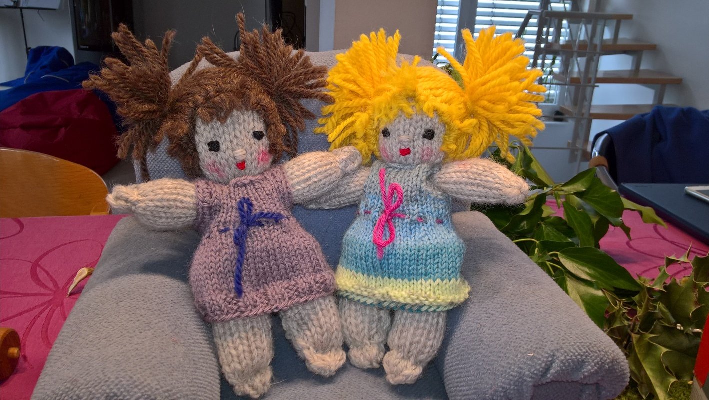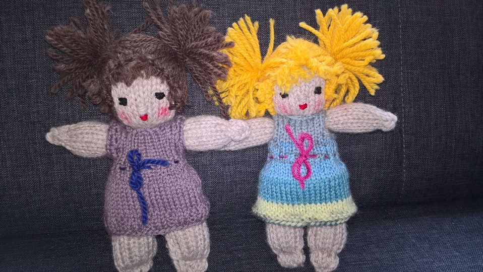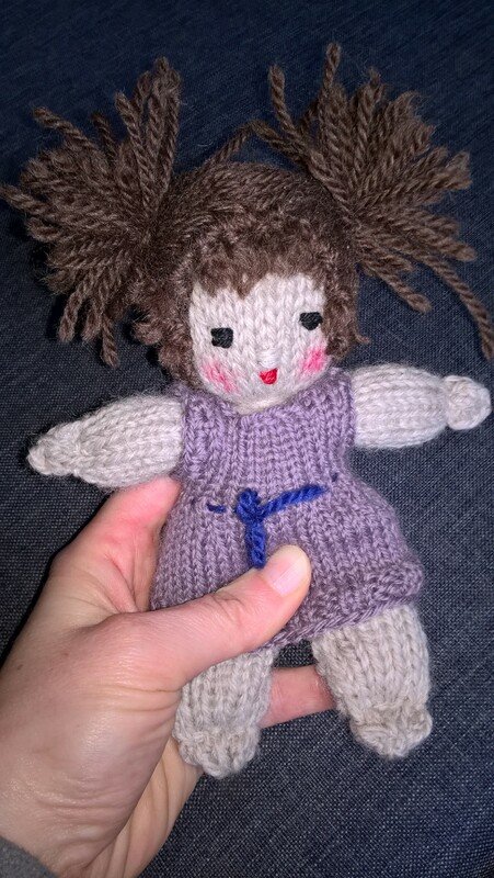 Die Größe ist abhängig von der verwendeten Wolle. Ich habe mit einer Wolle der Lauflänge 100 m und Stricknadeln der Stärke 4 gearbeitet. Dann haben die Püppchen eine Größe von ca. 25 cm.