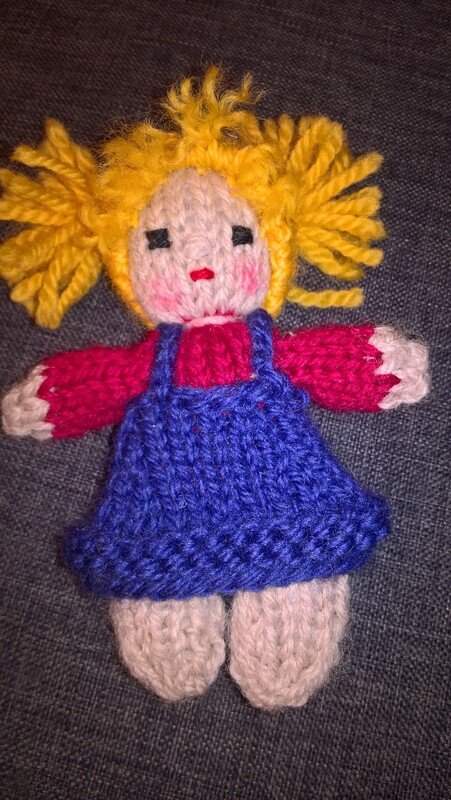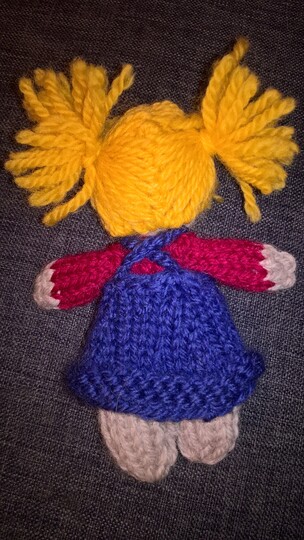 Die Größe ist abhängig von der verwendeten Wolle. Ich habe mit einer Wolle der Lauflänge 100 m und Stricknadeln der Stärke 4 gearbeitet. Dann haben die Püppchen eine Größe von ca. 15 cm.