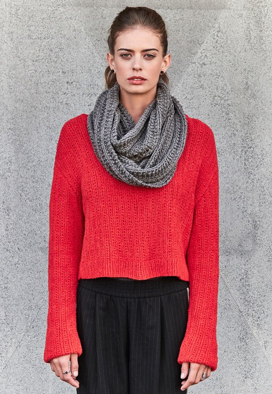 LANGYARNS "Velluto" (65% Viskose, 35% Polyamid, LL ca 105 m/50 g): Pullover: ca 400 (450) g Rot Fb 0064; Prym-Stricknd 4 und 4,5 mm, eine Prym Rundstricknd 4 mm, 80 cm lang. 1 Reißverschluss von Opti, 14 cm lang, Fb 0004, Bestellnr 80530014; Loop: ca 300 g Grau Fb 0024; Prym Stricknd 7 mm.