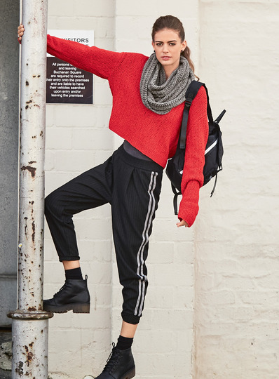 Rot im Visier - Ab sofort herrscht wieder Pulli-Alarm! Mit verkürzter Form, Strukturmuster und Zipper im Rückenteil zeigt er sich mega-stylisch. Dekorativ und wärmend: ein Loop - im falschen Patentmuster gestrickt.