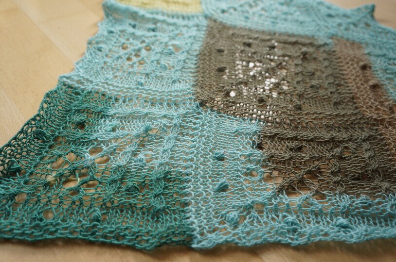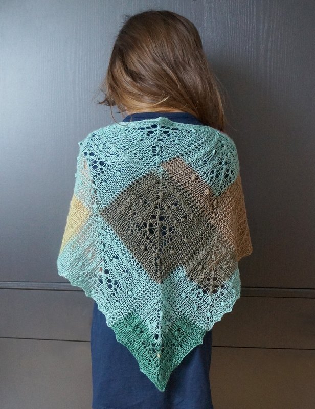 Dieses Dreieckstuch wurde mit einer Variante des mitered square Musters gestrickt. Meine Überlegung war, dass es möglich sein muss, das mitered square aufzupeppen und mehr Struktur in das Muster zu bekommen.