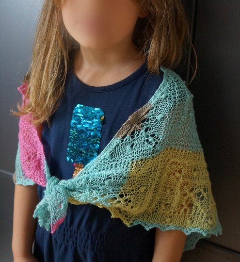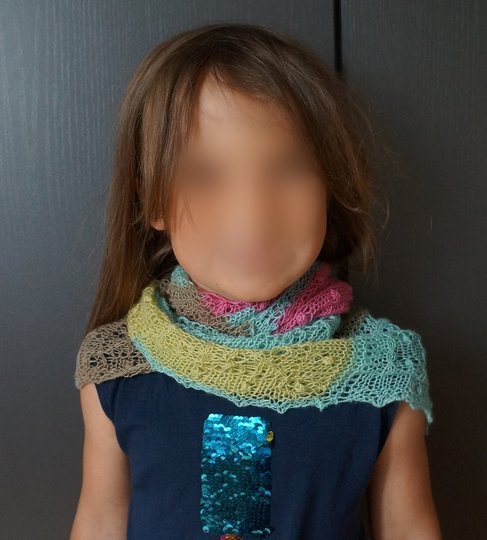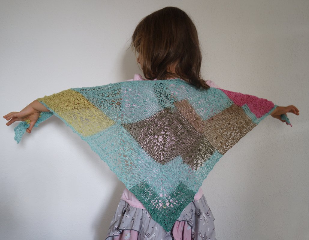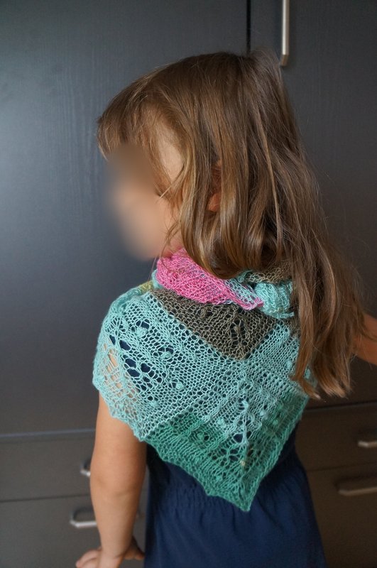 Das Dreieckstuch ist für meine 5 jährige Tochter, daher habe ich es kleiner gestrickt. Du kannst die Größe selbst entscheiden, je nachdem, wie viele Rauten Du aneinander strickst.