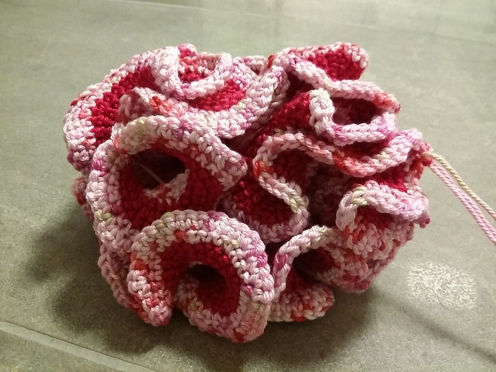 Coralita wird bei Verwendung von Nadelstärke 2,5 und Baumwollgarn mit einer Lauflänge von 125/m je 50 Gramm rund 30 cm groß