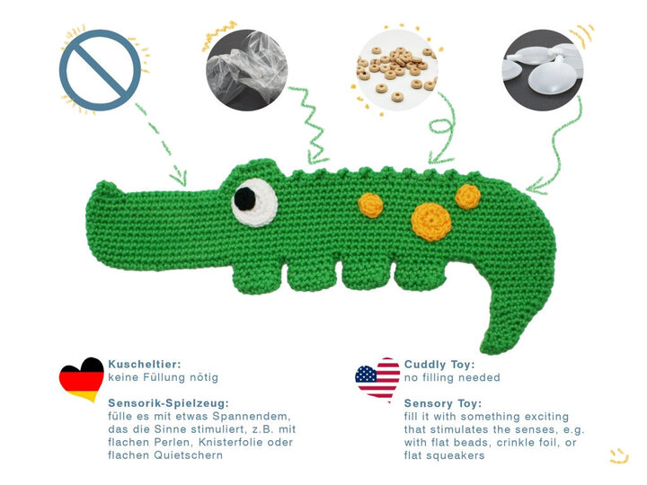 Mit Sport Garn (z.B. Catania Originals) und 3.0 mm Nadel wird das Krokodil etwa 25 cm lang und 11 cm hoch.