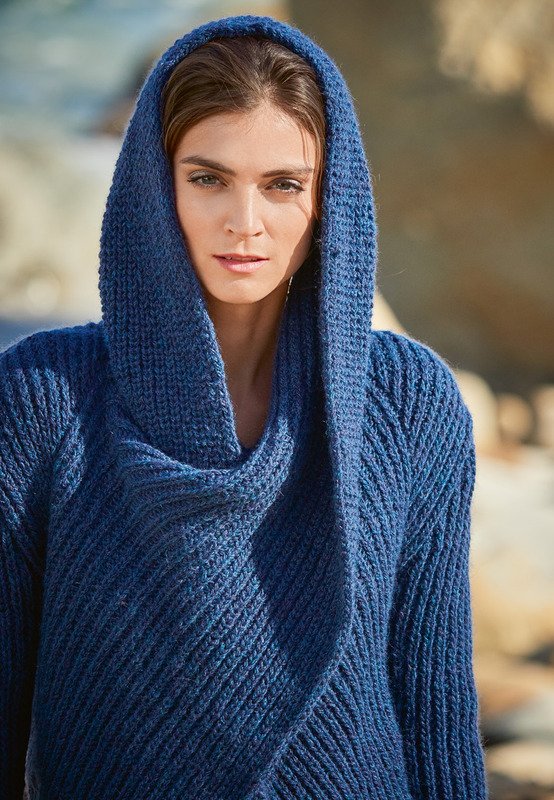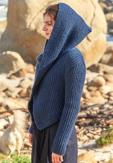 Coole Idee, - denn bei dieser Wickel-Jacke lässt sich der angestrickte, breite Schal mal als Kapuze oder Loop tragen. Ein echter Kältekiller, denn sie wird aus einer voluminösen Alpaka-Wolle im Patentmuster gestrickt.