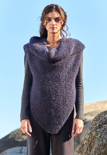Neuer Look - für einen Klassiker! Unser Pullunder schmückt sich mit einem großen, weiten Rollkragen, der sich ganz locker über die Schultern schmiegt, oder als Kapuze tragen lässt. Gestrickt wird er komplett rechts.
