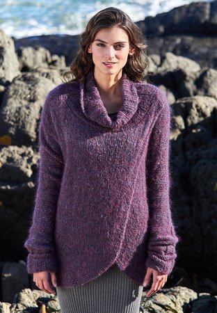 Schulana "Alpavisco" (38% Alpaka, 31% Viskose, 31% Polyamid, LL ca 150m/50 g): 400 (400-450) g Lila Fb 24; Pony Stricknd 5 mm, eine kurze Rundstricknd 4,5 mm, je eine längere Rundstricknd 4,5 mm und 5 mm.