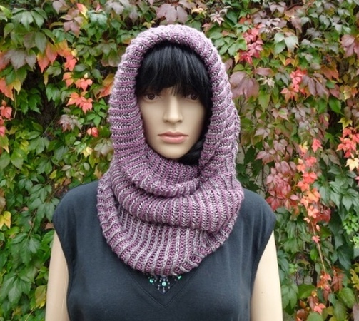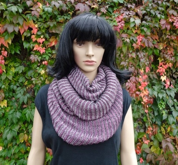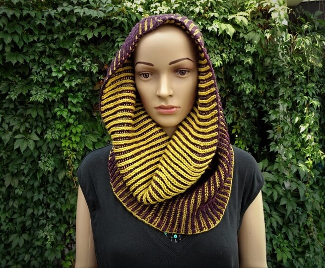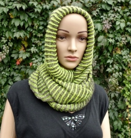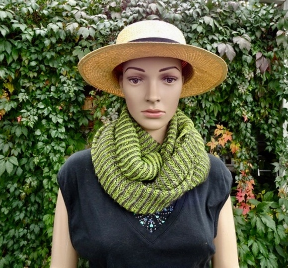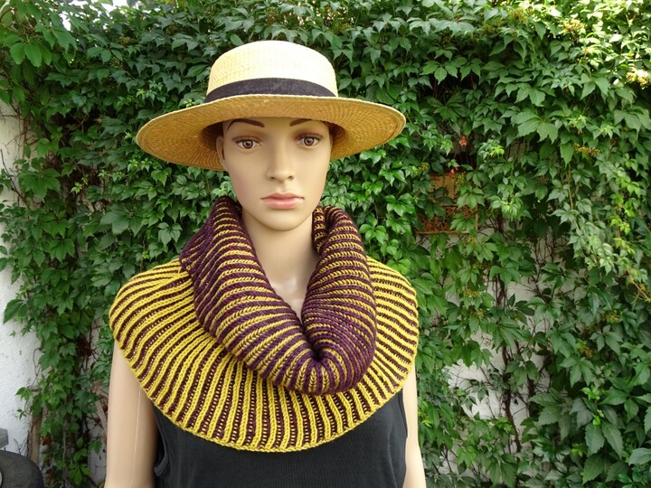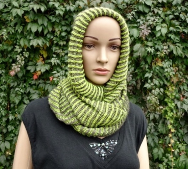 Der fertige Cowl hat eine einfache Breite von 39 cm, die grüne Version von 55 cm.