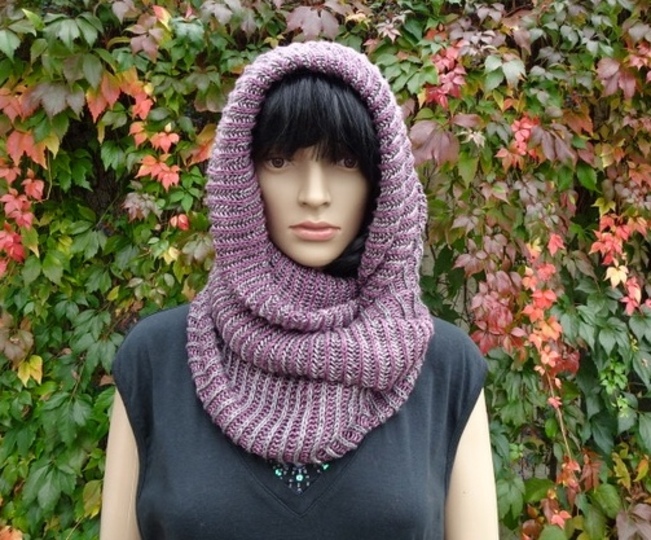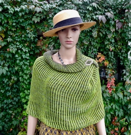 Die grüne Version ist mit mehr Maschen gestrickt und bewusst größer, da es als Cape und Kaputze getragen werden soll, er ist mit dünnerer (Fingering) Wolle gestrickt.