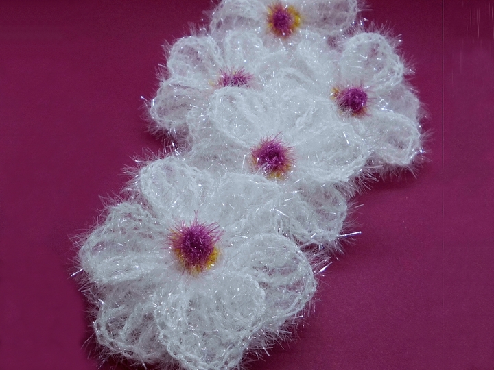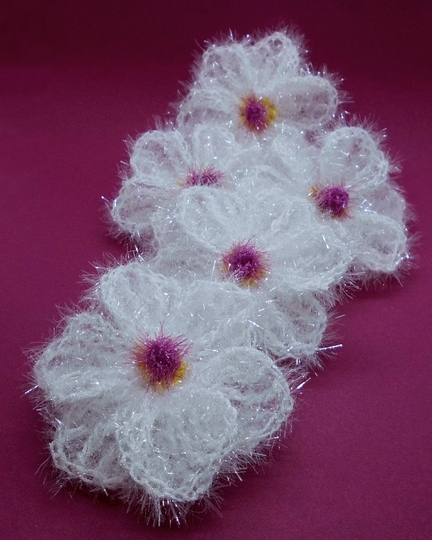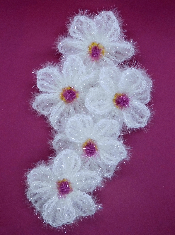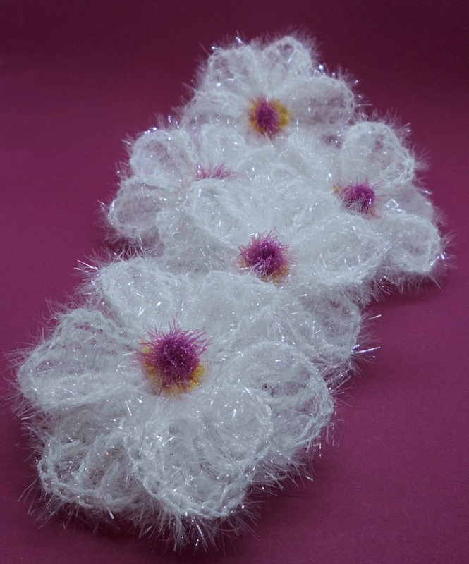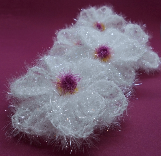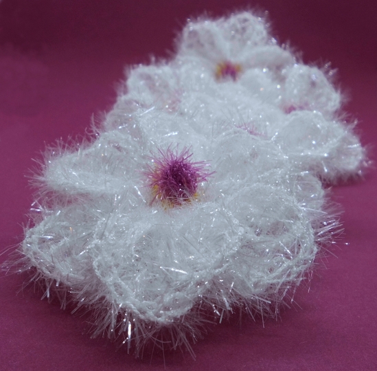 Die Blüten werden, aus Schwammgarn mit Häkelnadel 4,5 gehäkelt, ca. 9x9 cm groß.