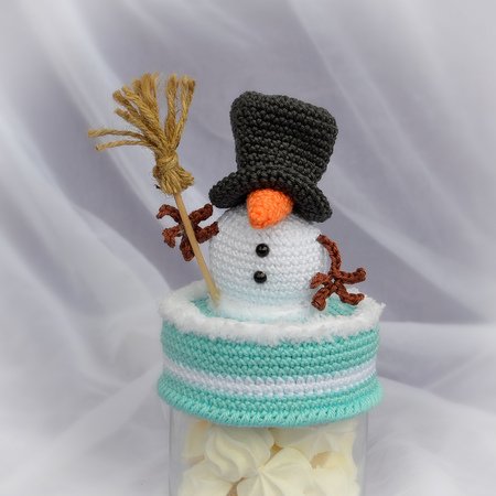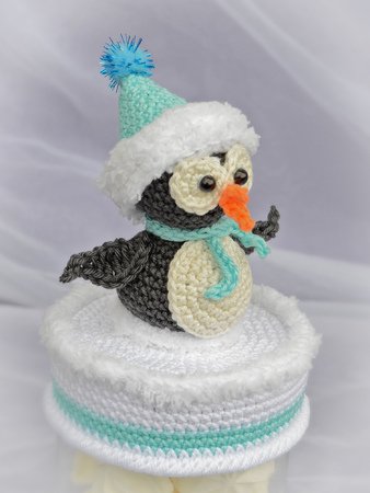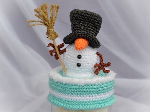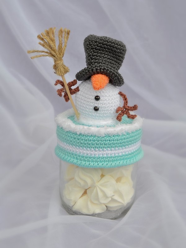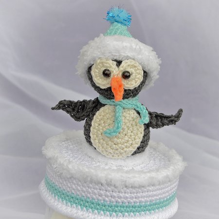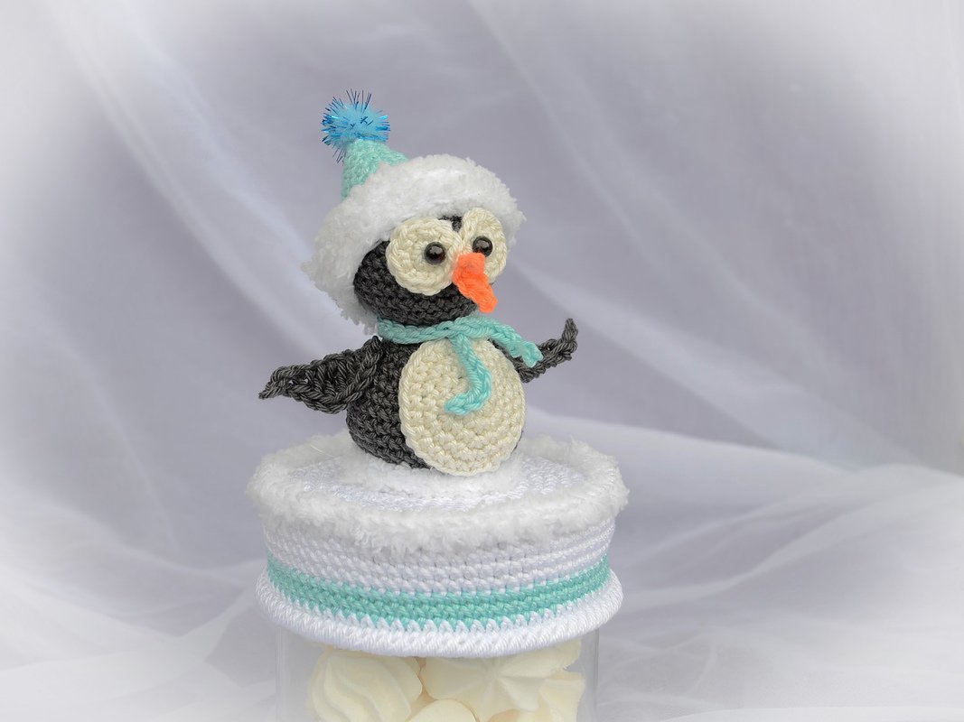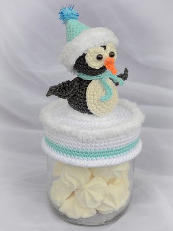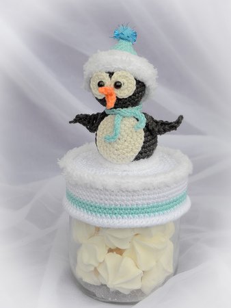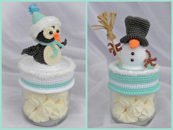 3tlg Sparset Häkelanleitungen für Marmeladenglasdeko "Pinguin, Schneemann mit Schlapphut und Deckelbezug"