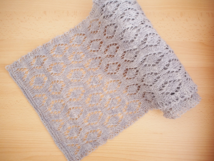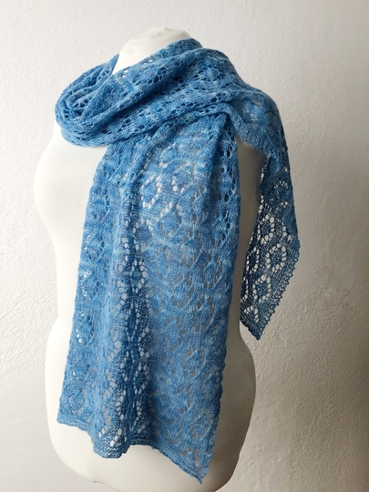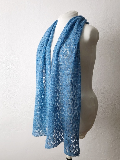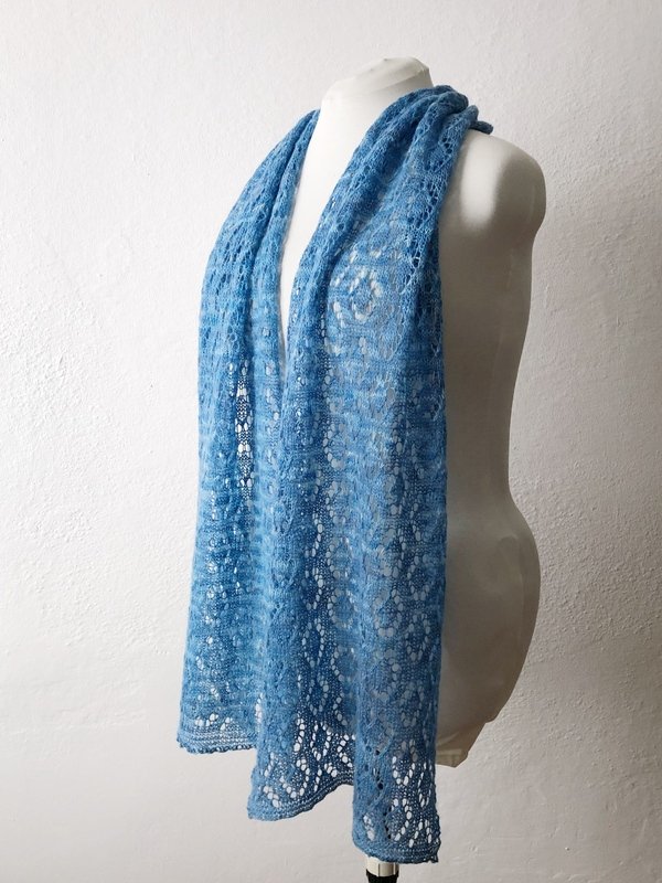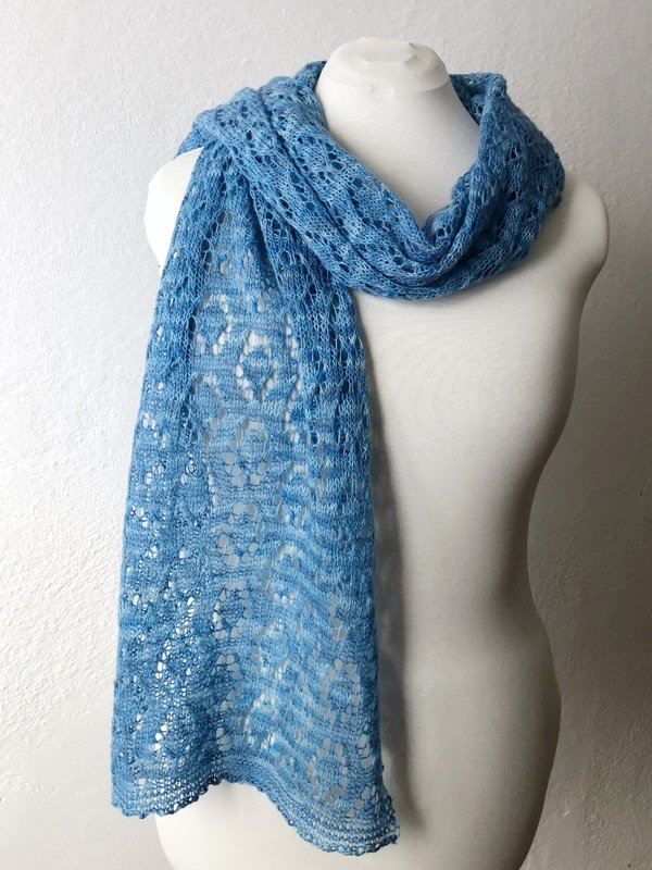 … ist ein leichter Sommerschal. Du kannst ihn prinzipiell aus jedem Lace Garn stricken das du möchtest, du brauchst nur 100g dafür. Der Schal wird gestrickt bis entweder das Garn zur Neige geht oder du deine gewünschte Länge erreicht hast.