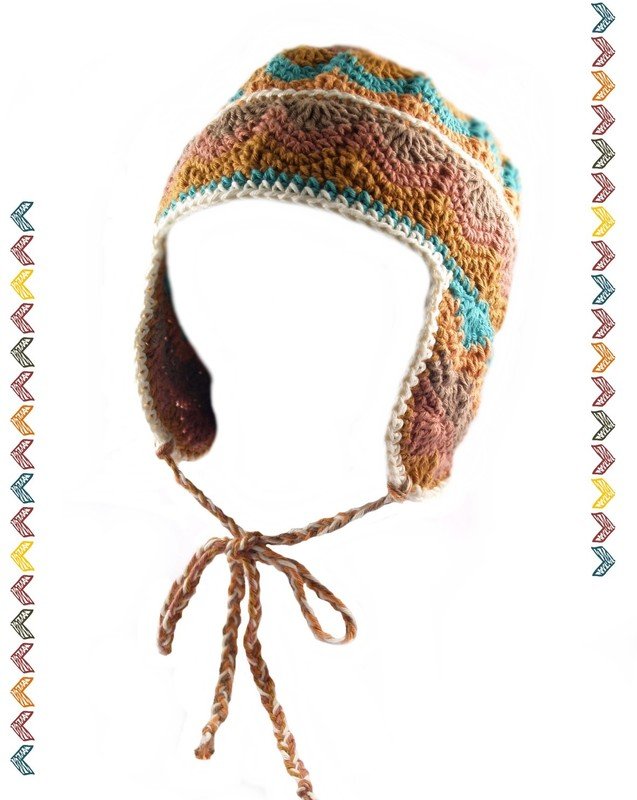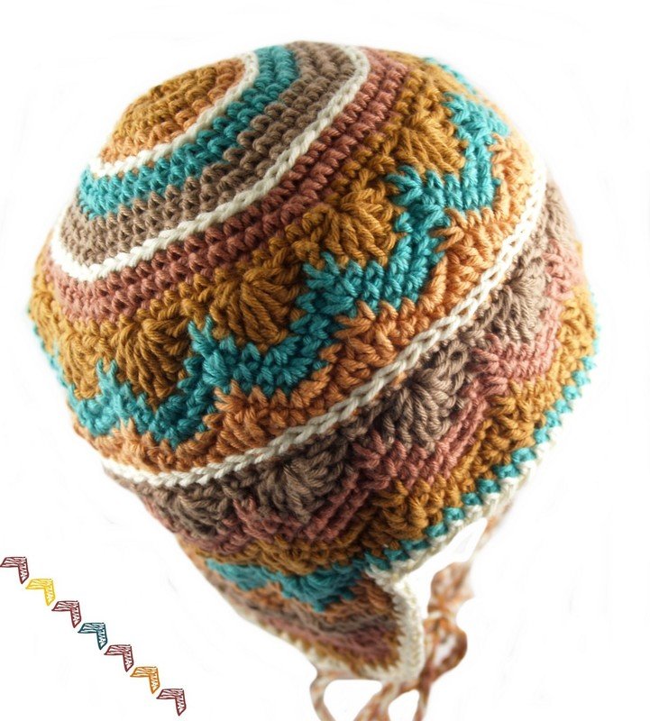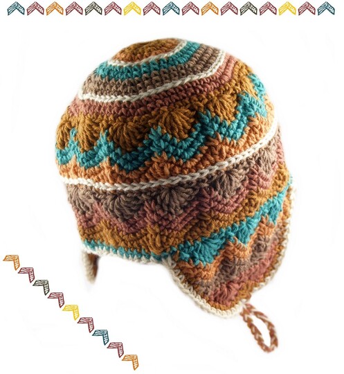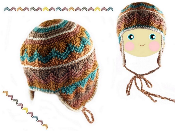 Babymütze mit Ohrenklappen im Ethnomuster: Die Anleitung erklärt dir auf 20 Seiten, wie du das Zick-Zack- und Rautenmuster Schritt für Schritt häkeln kannst, wie du die Garnfarben wechselst, die Ohrenklappen anfertigst und die Mütze mit kleinen Details fertigstellst.