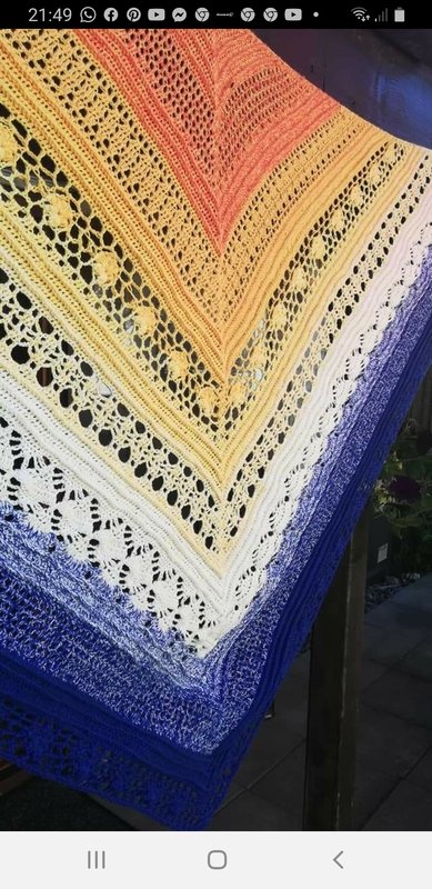Das kleine Tuch habe ich nach 1300 Meter Garnverbrauch beendet und es ist 186 cm breit und 93 cm hoch.