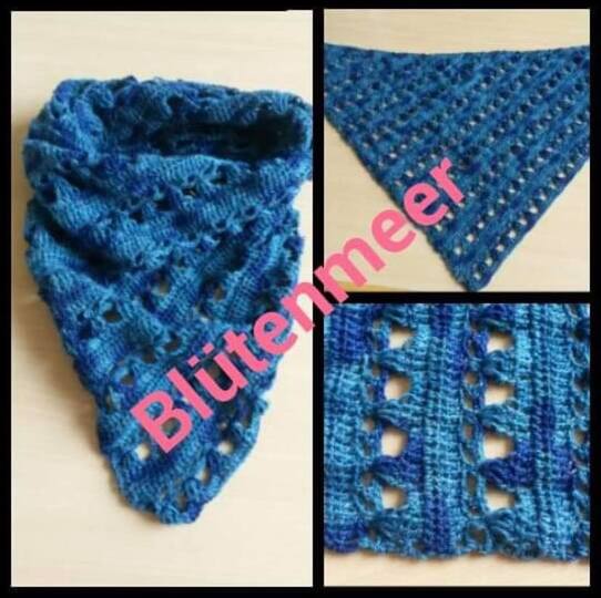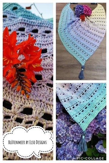 Diese Datei enthält die erste von 3 Versionen des "Blütenmeeres" von Elso Designs. Diese Version ist asymmetrisch. Es wiederholen sich immer 6 Reihen die sich jedoch leicht merken lassen. Die Größe ist wie immer variabel, je nach Garn.