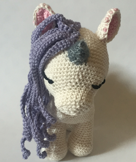 Häkelanleitung für ein entzückendes Einhorn auf allen vier Beinen stehend mit lila Mähne. 8 Seiten Schritt für Schritt Anleitung mit vielen Bildern