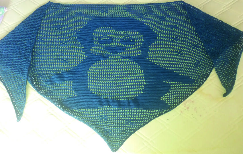 Das Tuch ist ca.LxB 200 cm x 83 cm, dafür habe ich 3,5 Knäul a` 380m / 100g benötigt.