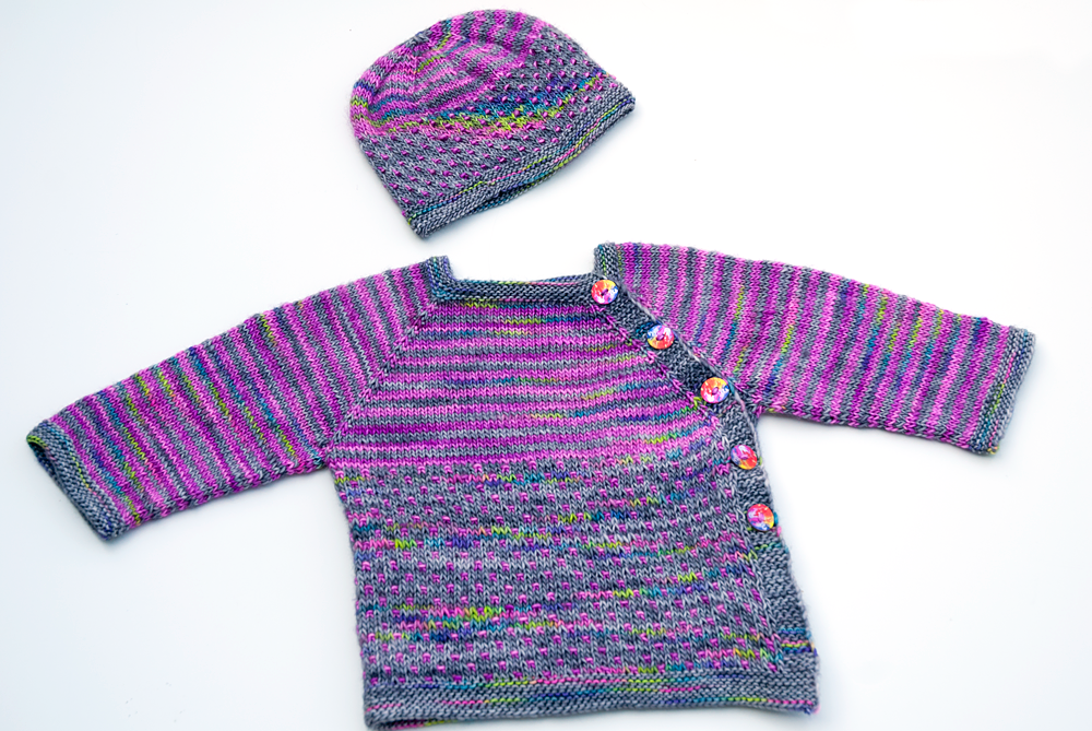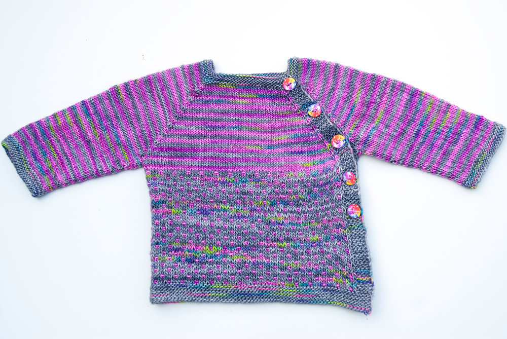 Lotta ist einem so genannten "Schweizer Schlüttli" nachempfunden - einem Pullover bzw. einer Jacke, die seitlich geknöpft wird, sodass sie dem Baby nicht über den Kopf gezogen werden muss. Sie wird von oben nach unten in einem Stück gestrickt, zunächst in Streifen, später dann in einem einfachen Hebemaschenmuster. Letzteres ergibt süße kleine Pünktchen - aber dennoch muss auch hier niemals mit 2 Farben gleichzeitig gestrickt werden.