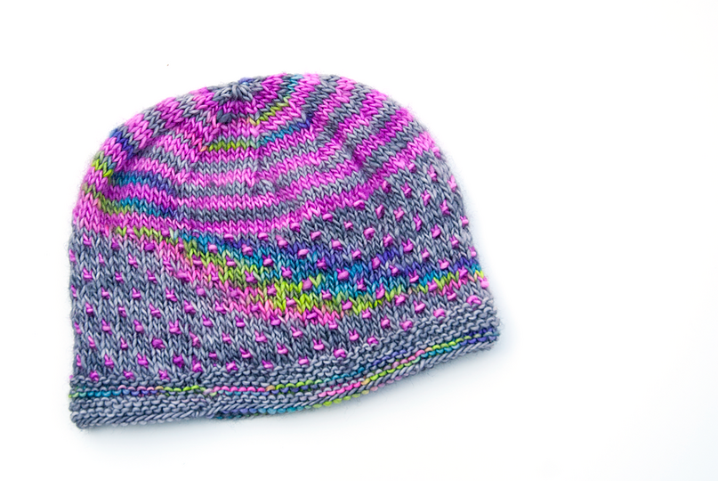 Die Mütze wird einfach in Runden gestrickt, Hebemaschenmuster und Streifen wiederholen sich auch hier.