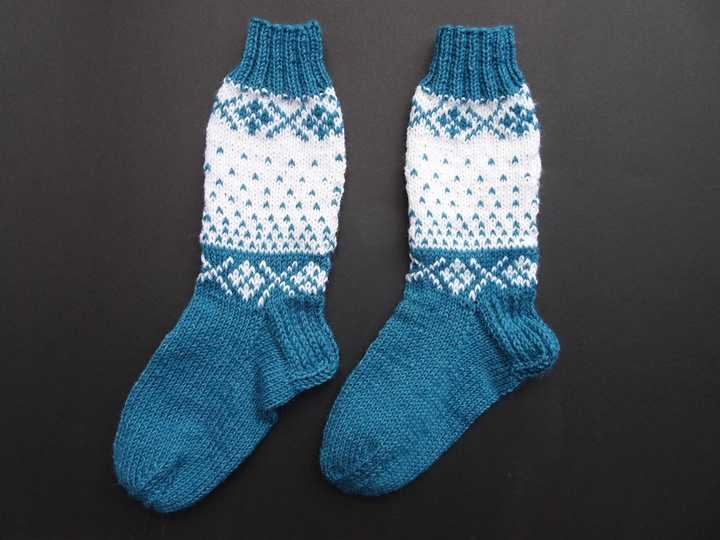 Benötigt wird ein Nadelspiel Gr. 3,5. Für die Socken habe ich ca. 100 g finnische Wolle (7 veljestä von Novita) in den Farben petrol und ca. 60 - 80 g in weiß benötigt .
