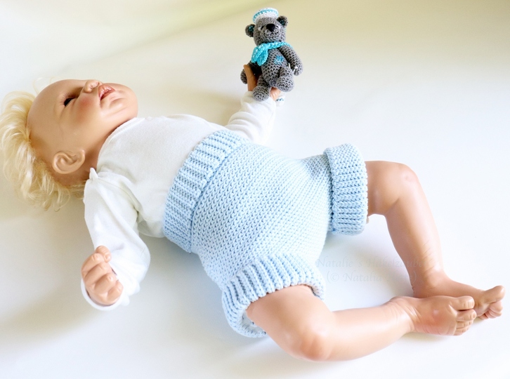 Diese PDF-Häkelanleitung besteht aus bebilderter Anleitung zum Häkeln von Windelhosen (Überhosen) mit dem Muster, das wie gestrickt aussieht, für die Größen ab 0 Monaten bis zum ca. 2-järiges Kind. Das Bündchen der Windelhosen sieht ebenso wie gestrickt aus.