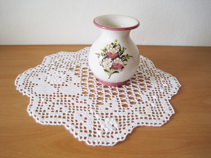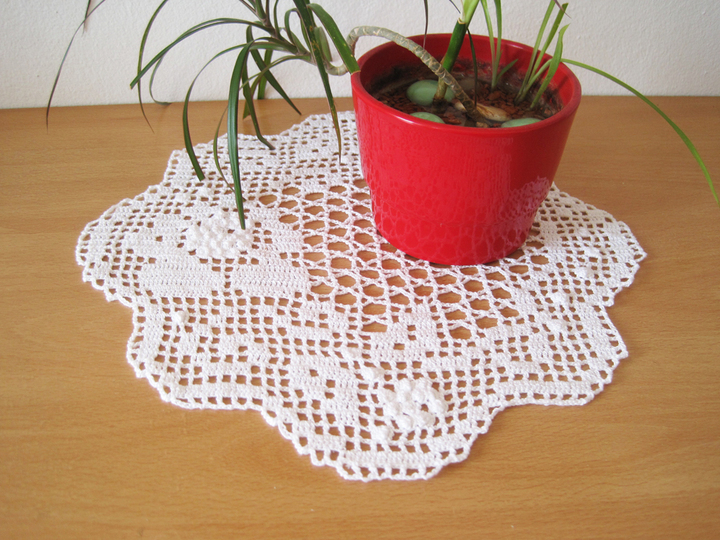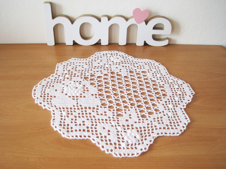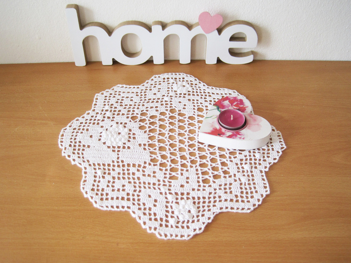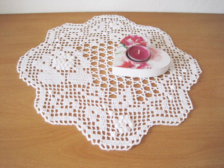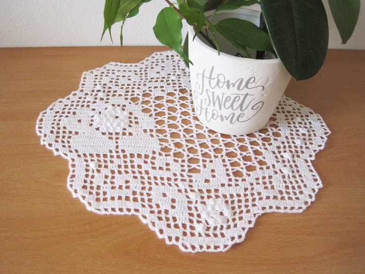 Beachte bitte, dass die Größe des Deckchens abweichen kann, wenn du anderes Garn verwendest oder eine andere Nadelstärke, wenn du fester oder lockerer häkelst als ich.